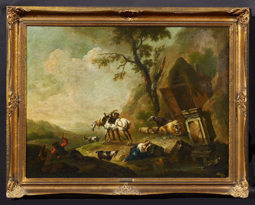 Italienische Landschaft mit Hirten und Vieh. Signatur von späterer Hand rechts unten. Öl auf Leinwand. Auf Holz gezogen. 90,5 x 120,5cm. Rahmen.