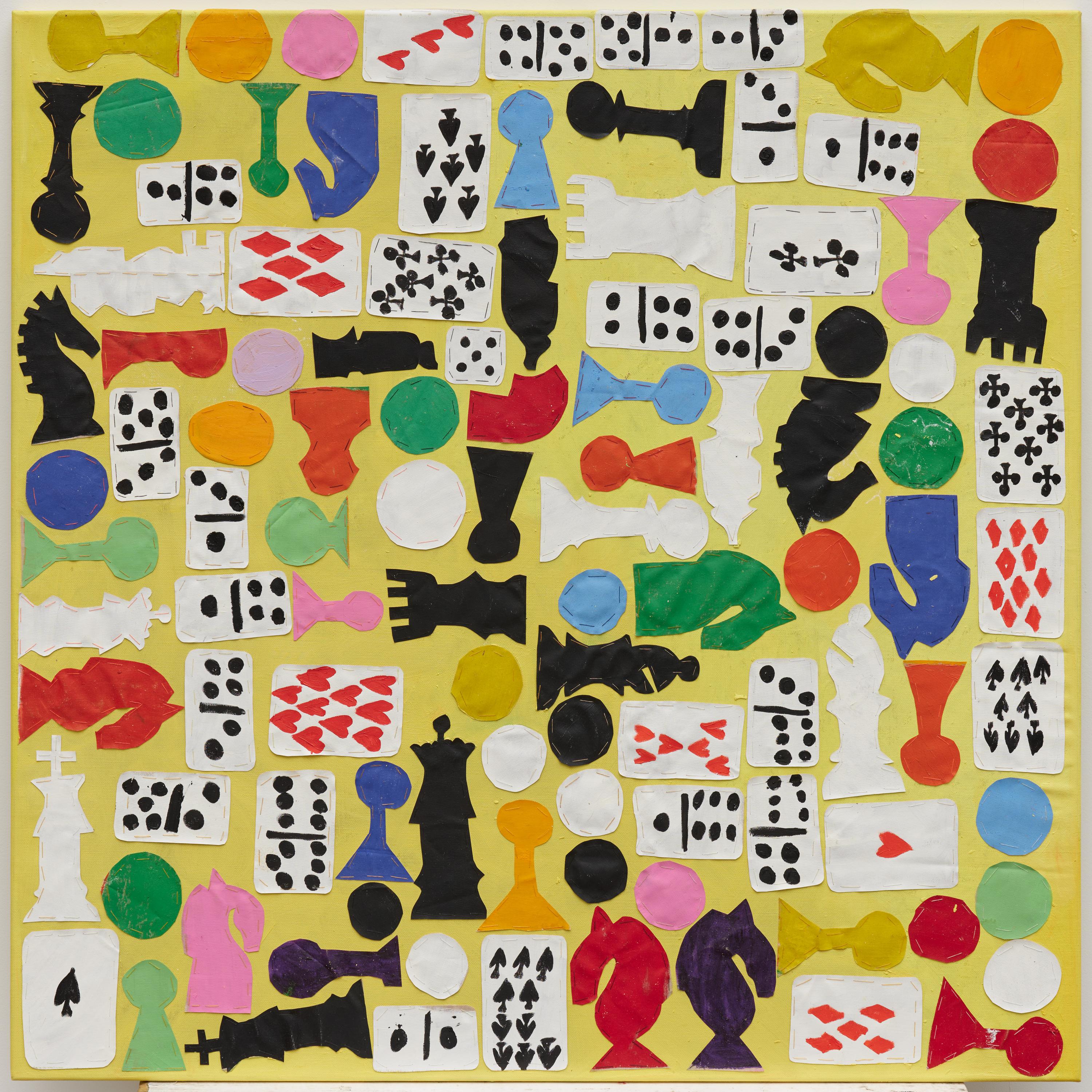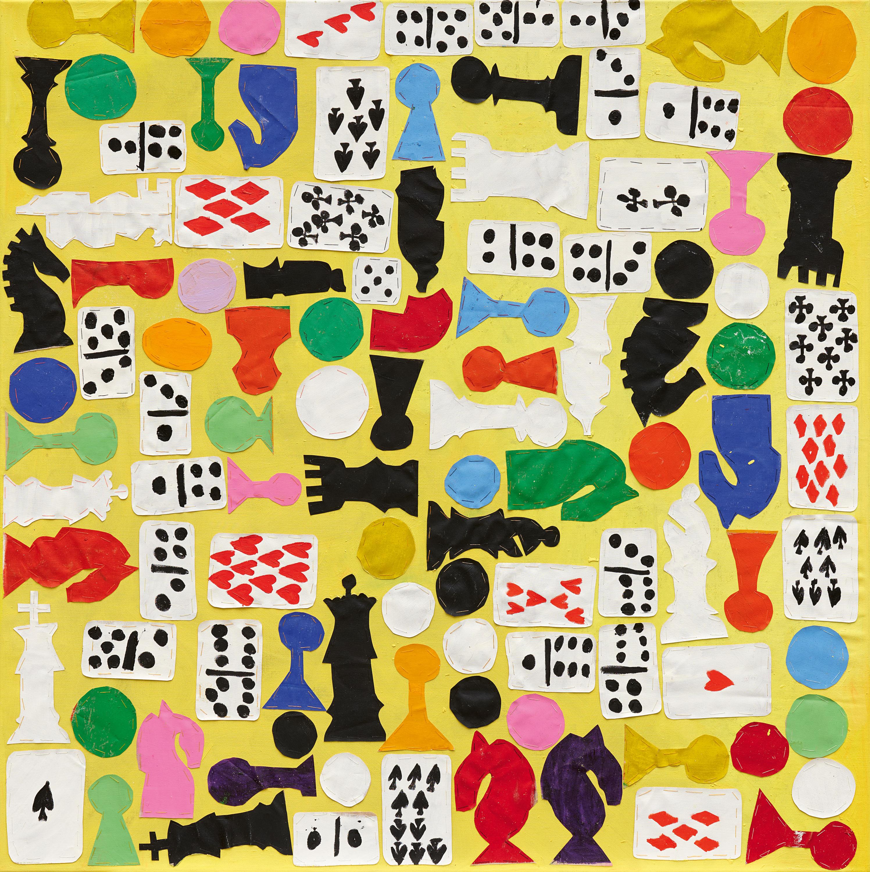 Technik: Öl und aufgenähte Stoffapplikationen auf Leinwand.