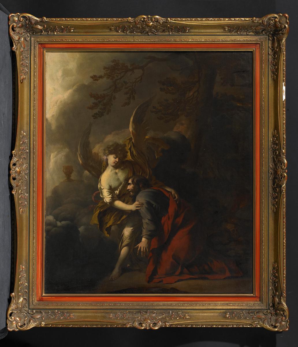 zugeschrieben. Tobias und der Engel. Signiert und datiert. unten mittig auf J. Voorhout ft. 1685 (Signatur nachgezogen). Öl. Leinwand x Doubliertcm. 64,5 Rahmen: