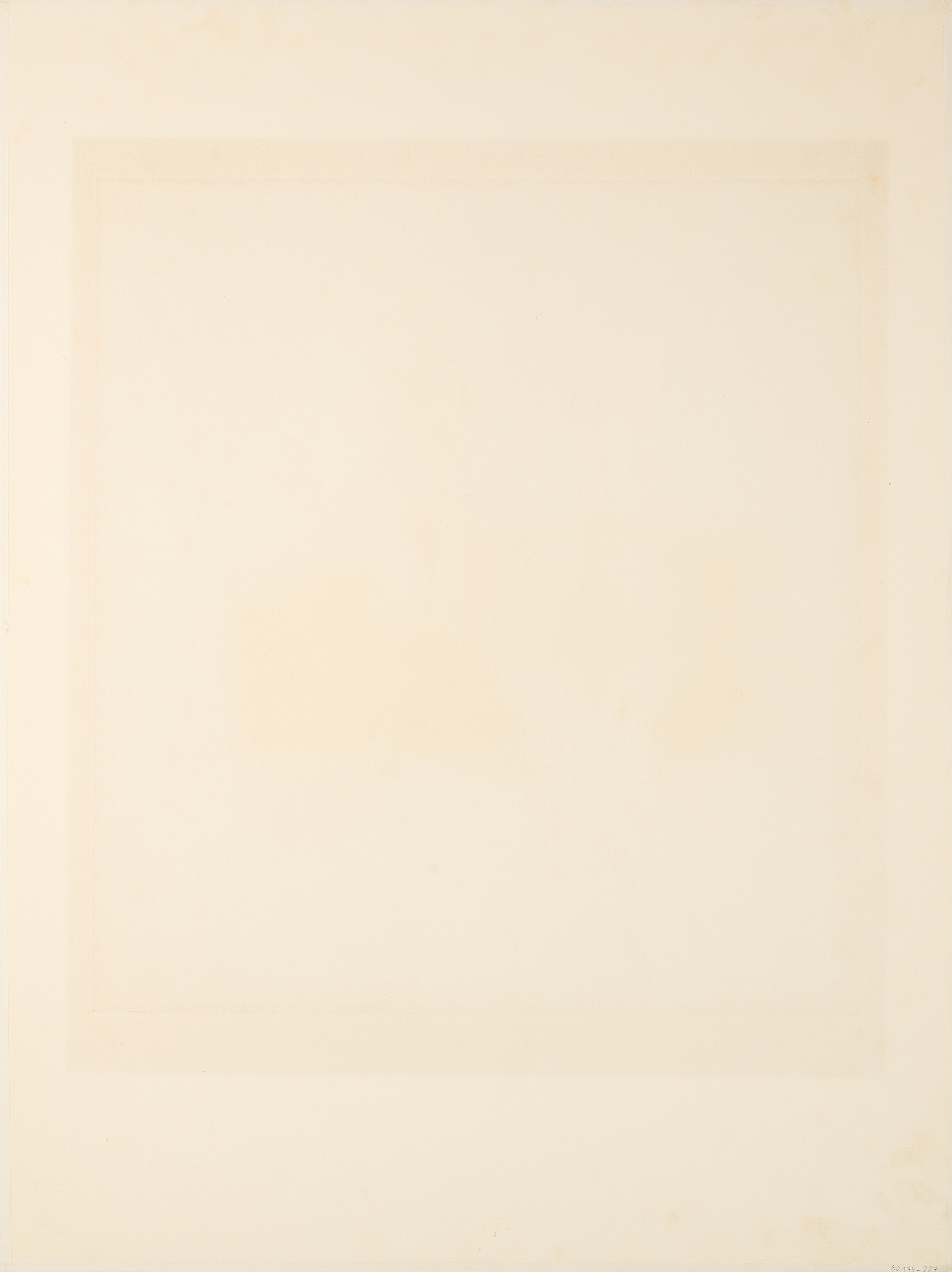 Ehemaliger Passepartoutausschnitt gebräunt. Rottöne geblichen. Ränder mit partiellen hellen, bräunlichen Verfärbungen. Verso Reste alter Montierung.