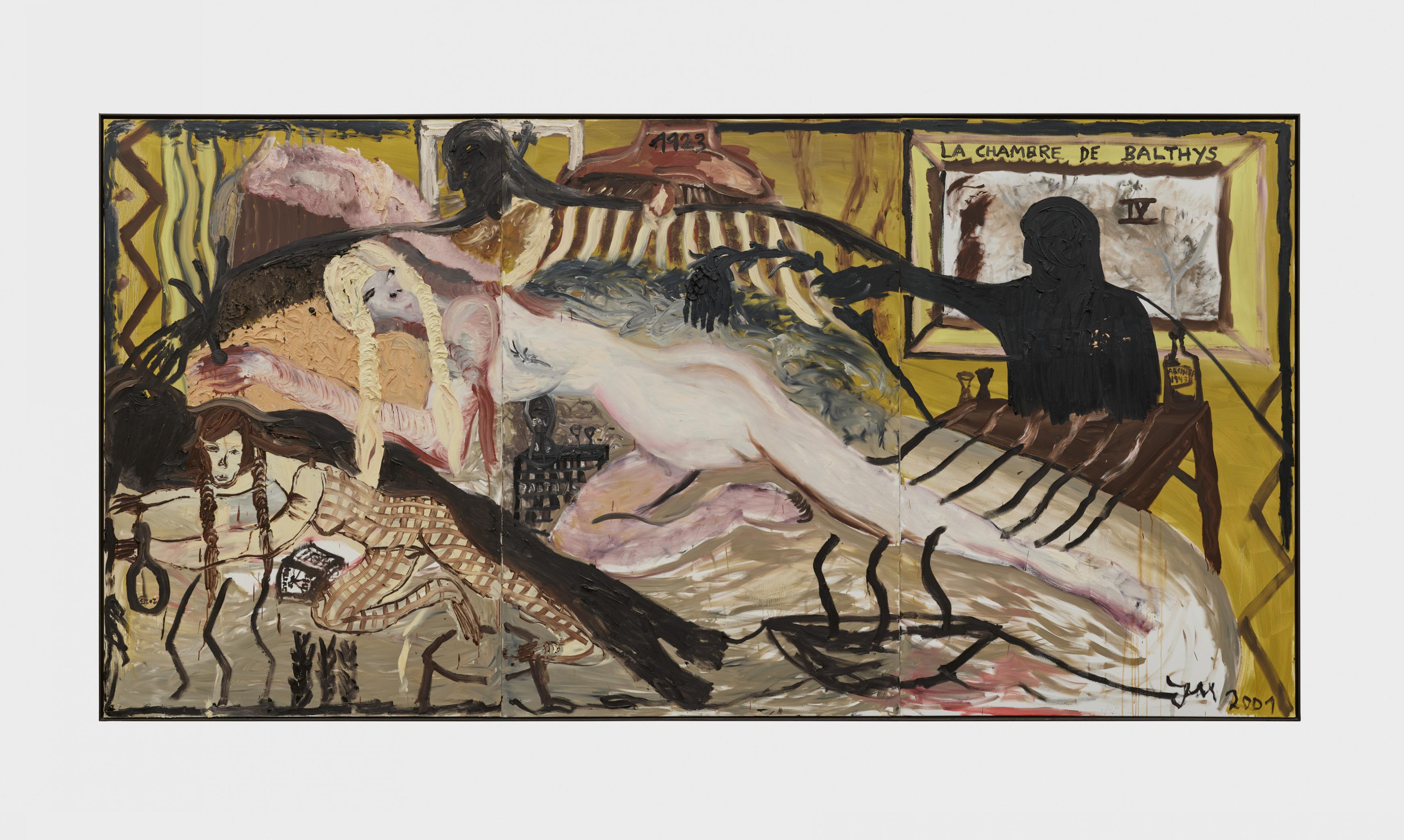 Das großformatige Triptychon "La Chambre de Balthys IV" von Jonathan Meese stammt aus dem Jahr 2001 und ist eine direkte Hommage an den polnisch-deutsch-französischen Maler Balthus (Balthasar Klossowski de Rola). Im Jahr 2001, dem Todesjahr von Balthus, konzipiert Meese die Arbeit als Teil einer Serie zu Ehren des Künstlers. Die Werkreihe setzt er fort und sie findet ihren Höhepunkt in der Rauminstallation "La Chambre secrète de BALTHYS par Jonathan Meese", in der Meese seine gefühlte Verbundenheit und Bewunderung für Balthus in raumfüllender, salonähnlicher Atmosphäre zur Schau stellt.
