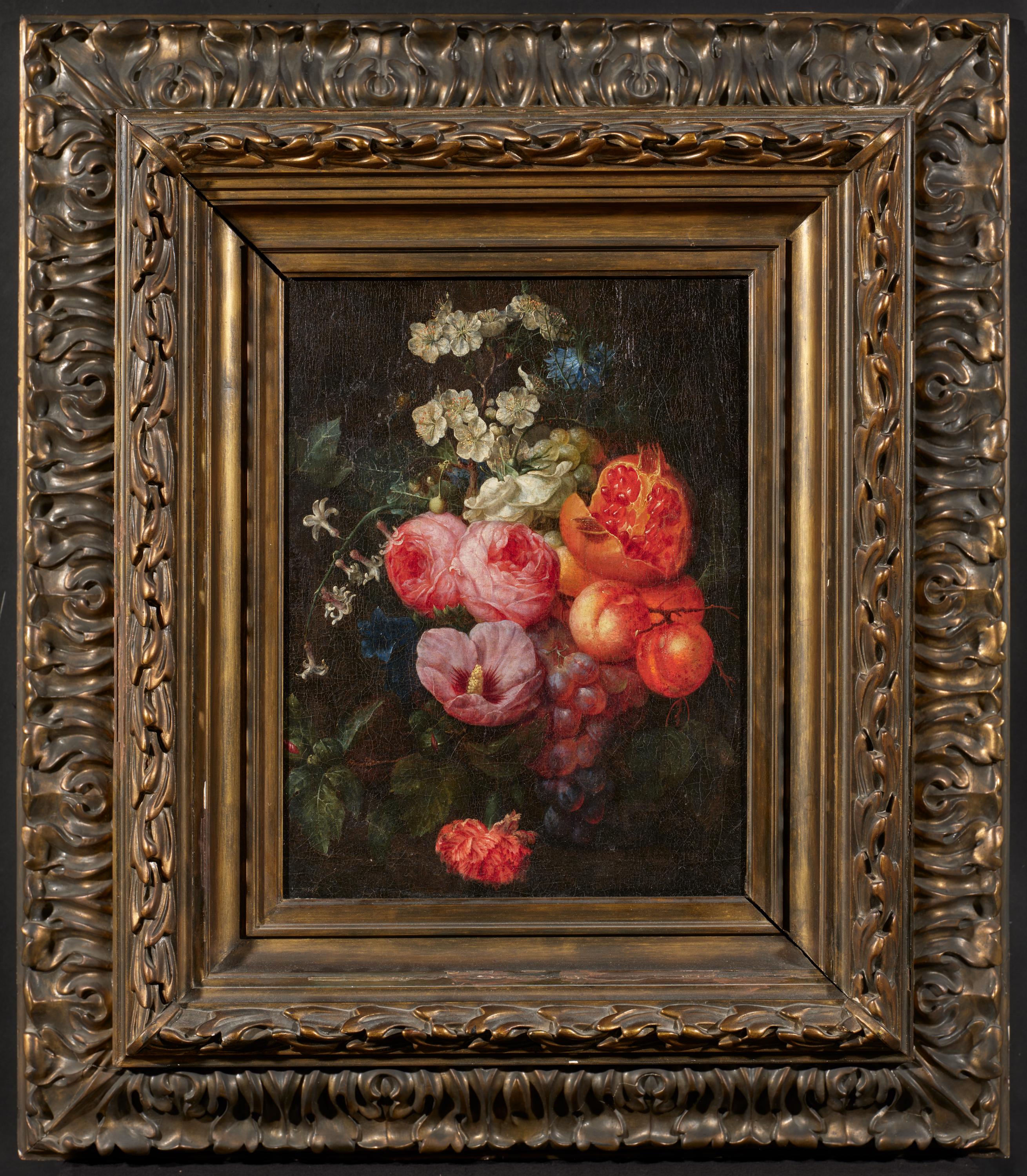 Titel: Stillleben mit Blumen, Granatapfel und Pfirsichen.
