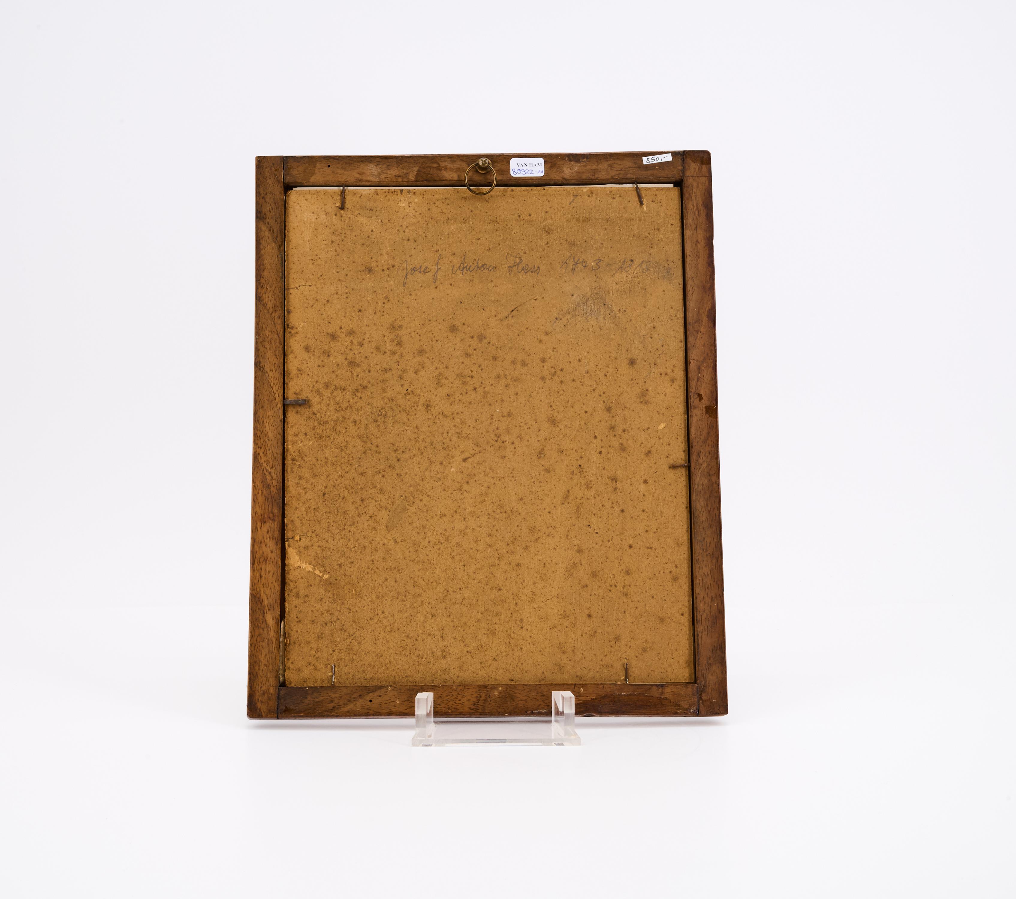 Technik: Farbloses Glas mit transparenter und opaker farbiger und goldener Malerei. Holzrahmen.