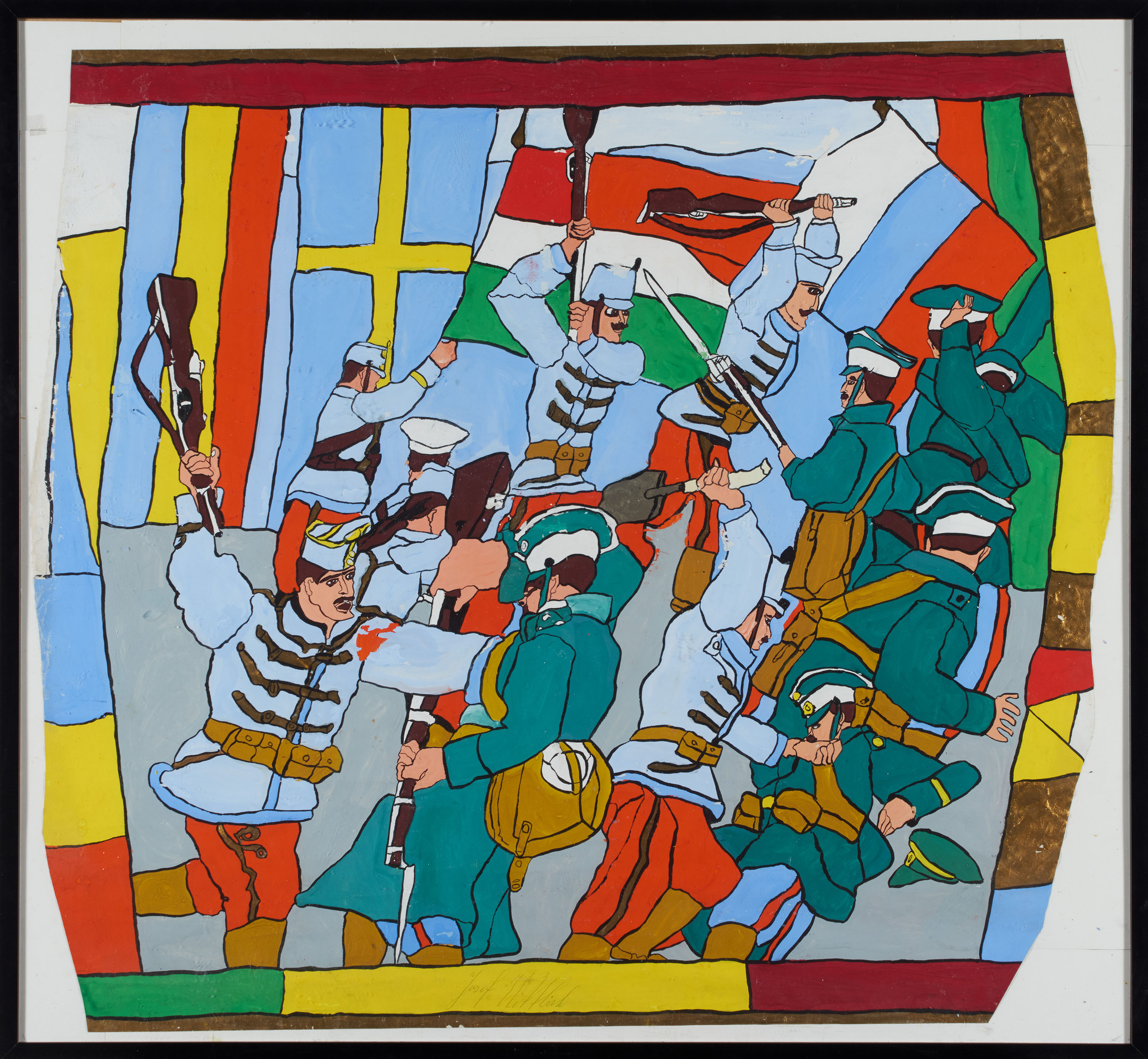 Blatt unregelmäßig beschnitten (werkimmanent). Farbabplatzungen, teilweise an der Plexiglasinnenseite anhaftend. Im Rahmen beschrieben.