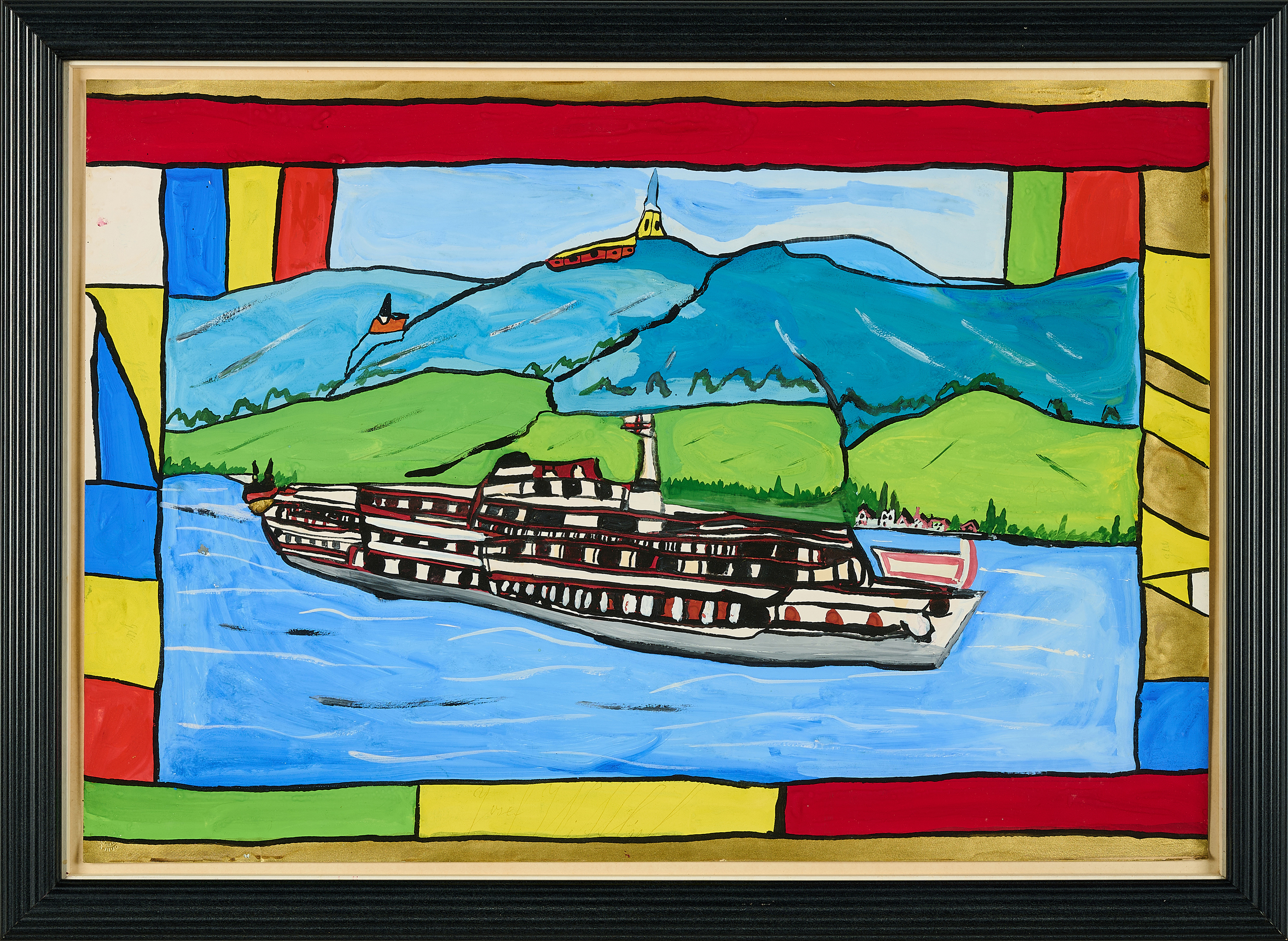 Titel: Rheinlandschaft mit Dampfer.