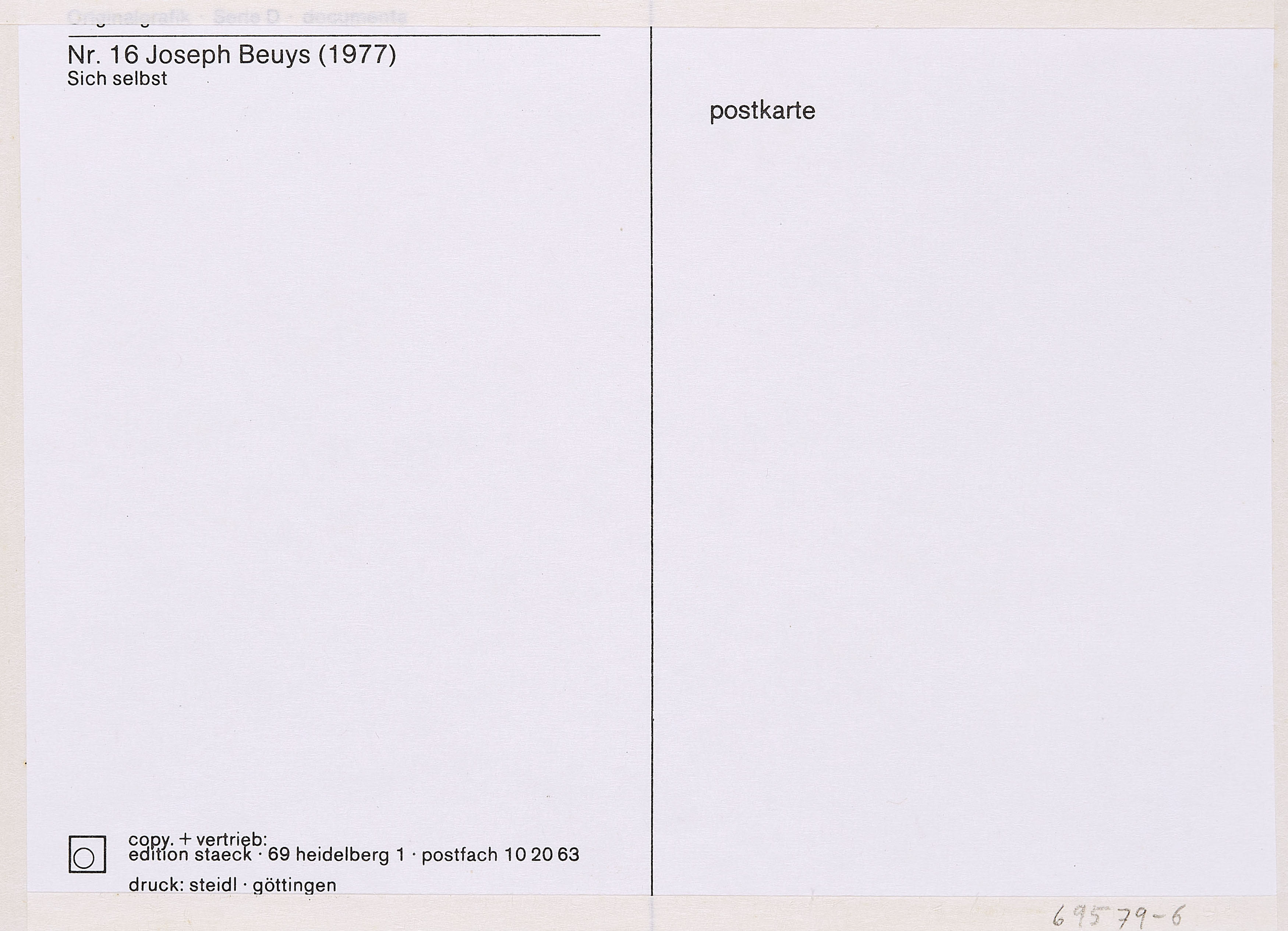 - Schellmann, Jörg (Hrsg.): Joseph Beuys - Die Multiples, Werkverzeichnis der Auflageobjekte und Druckgraphik, München 1992 (7. Auflg.), WVZ.-Nr. P44.