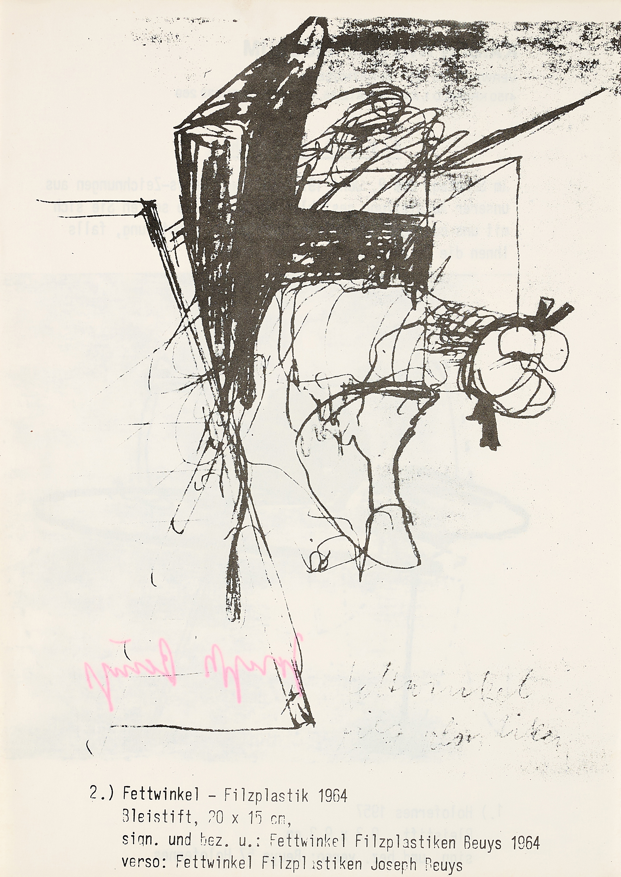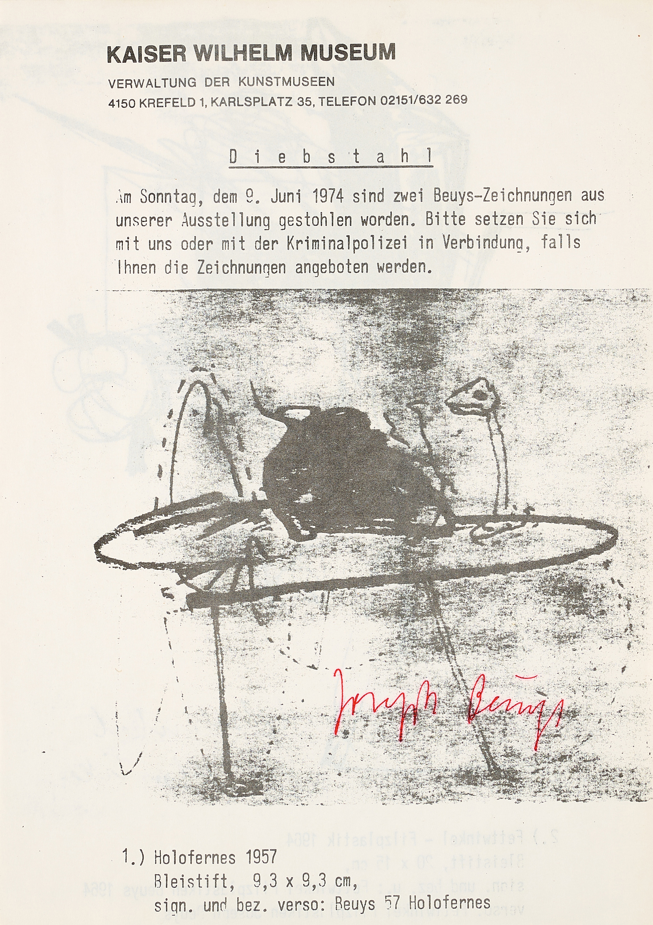 Aus der unlimitierten, unnummerierten Auflage, von der maximal 500 Exemplare entstanden. Beuys ließ hier eine Suchanzeige des Kaiser Wilhelm Museums Krefeld nachdrucken und verteilen. Was nicht verteilt wurde, hat er dann signiert in roter Tinte.