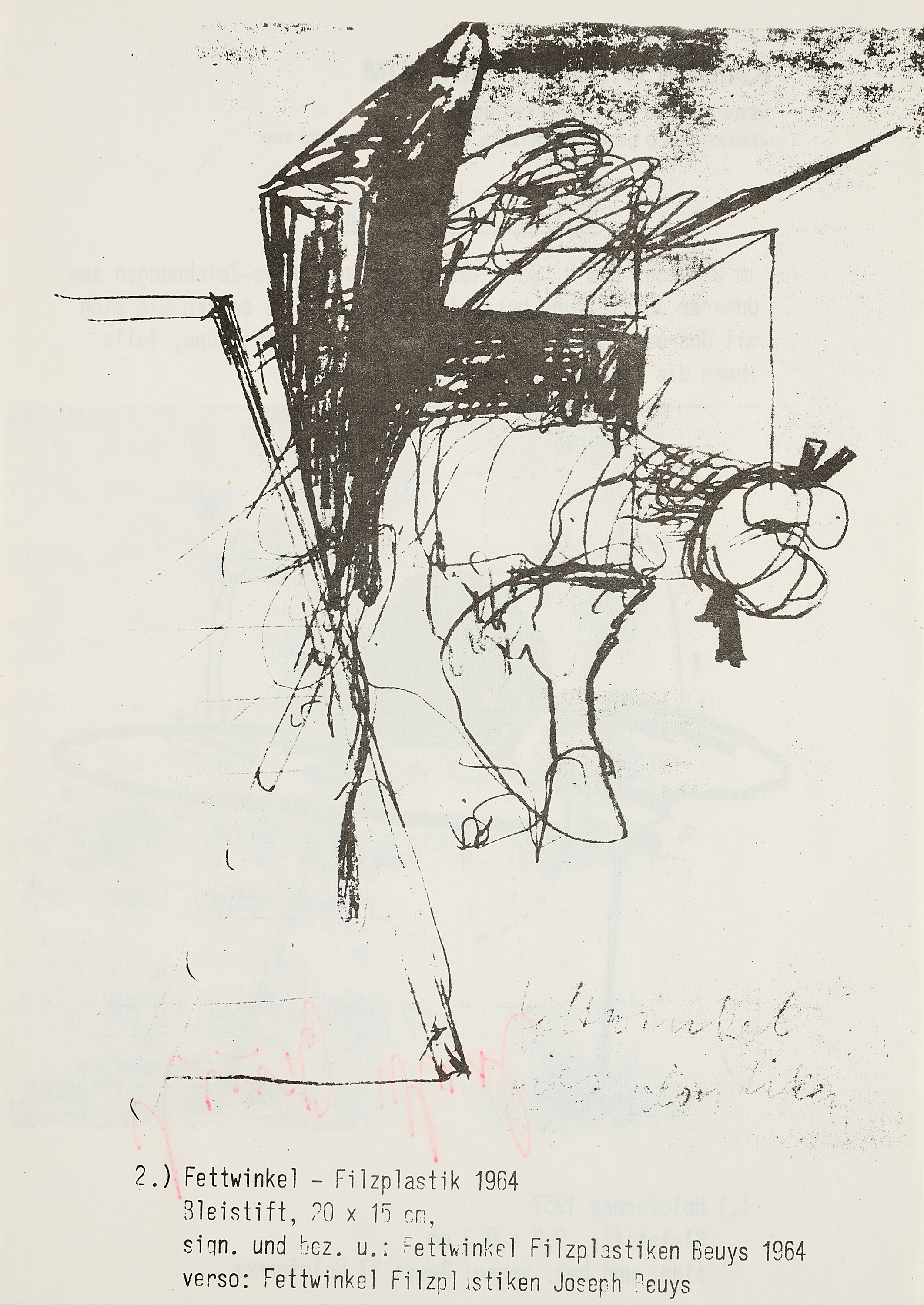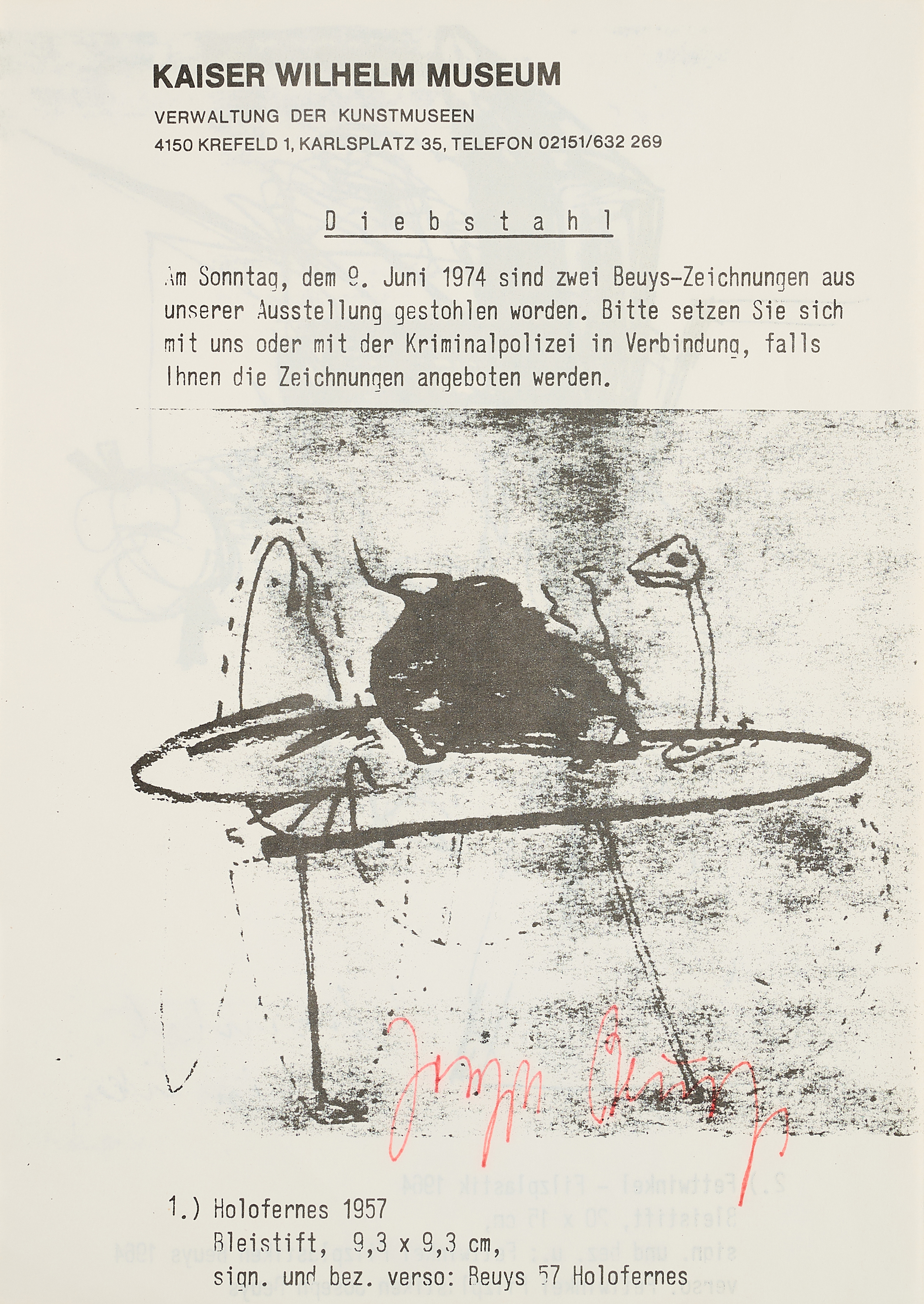 Aus der unlimitierten, unnummerierten Auflage, von der maximal 500 Exemplare entstanden. Beuys ließ hier eine Suchanzeige des Kaiser Wilhelm Museums Krefeld nachdrucken und verteilen. Die Blätter, die nicht verteilt wurden, signierte Beuys in roter Tinte.