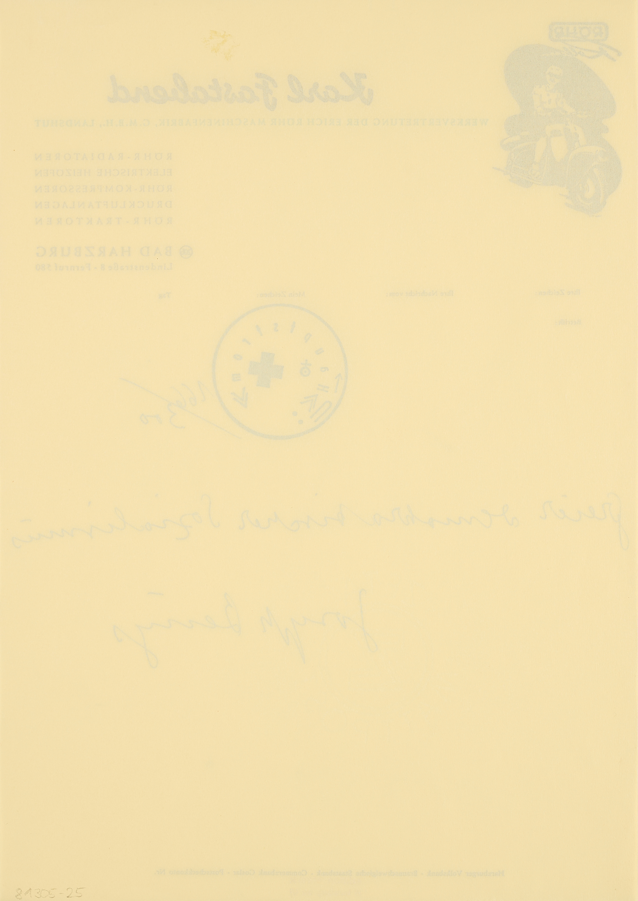 Technik: Handschriftlicher Text auf chamoisfarbenem Briefpapier, gestempelt.