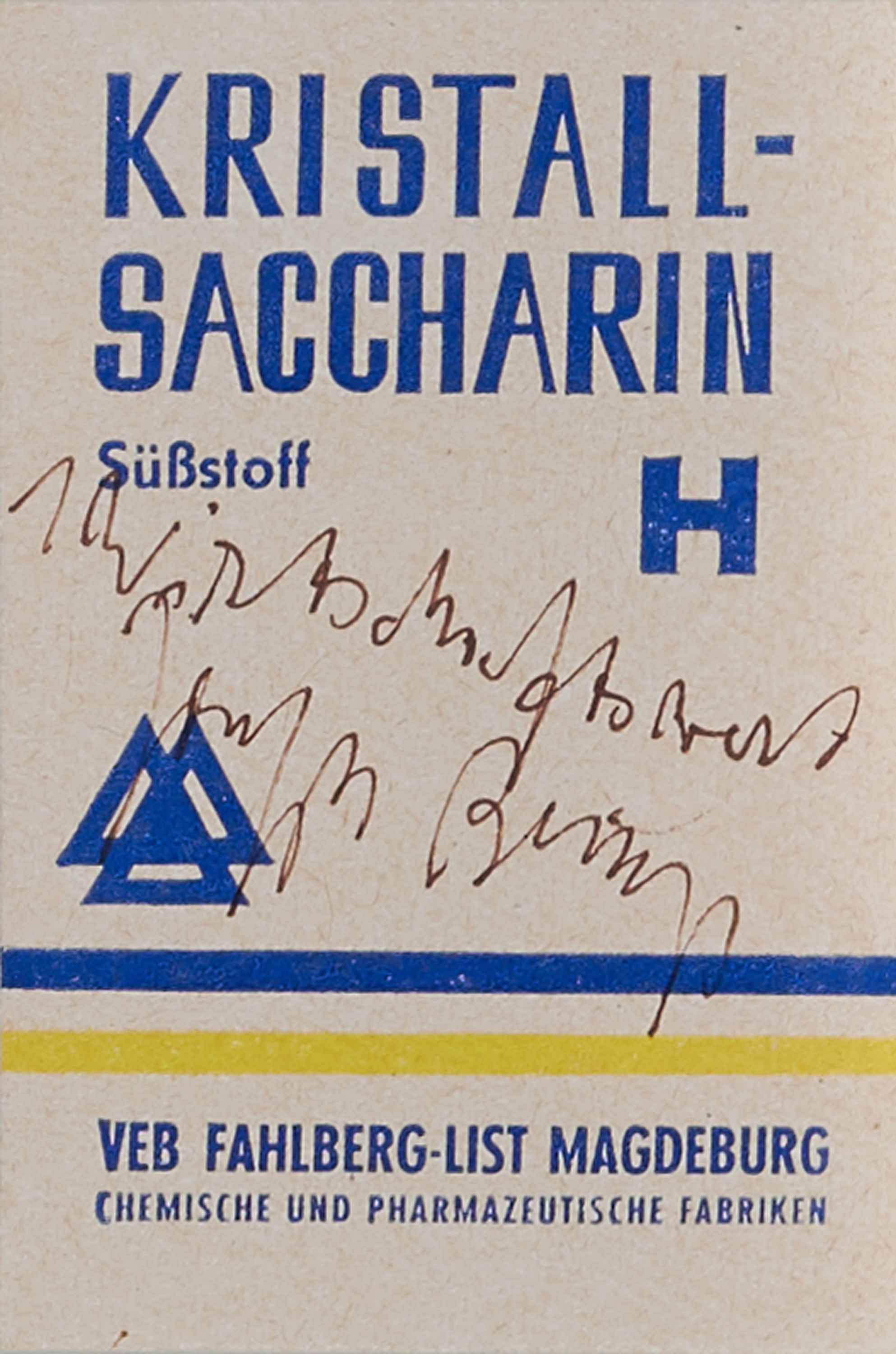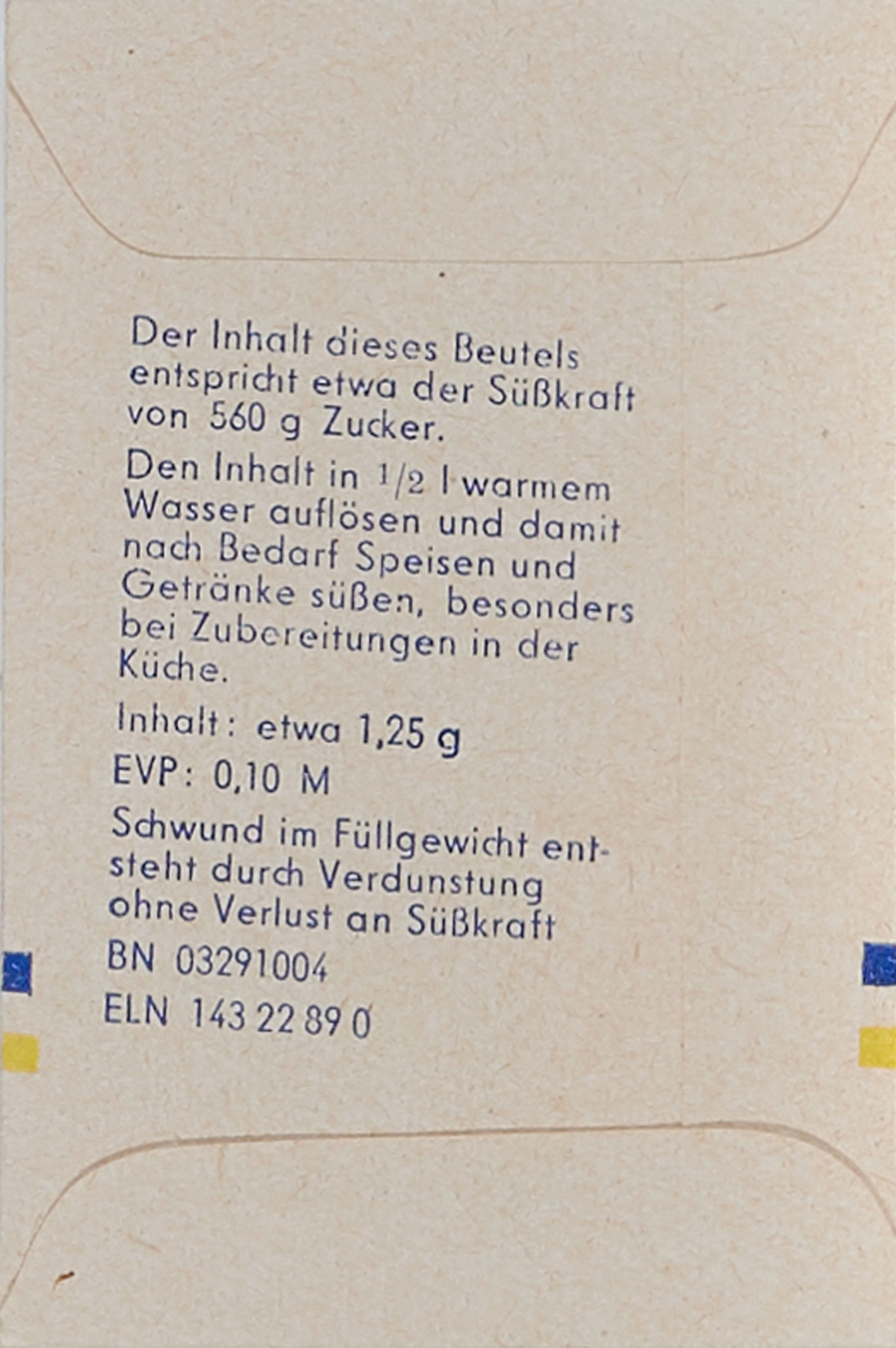 1 Wirtschaftswert (Süßstoff). 1977. Papiertütchen mit Süßstoff, mit handschriftlichem Zusatz: 1 Wirtschaftswert. 7,5 x 5,5 x 0,2cm. Signiert mittig: Joseph Beuys. Edition Staeck, Heidelberg (Hrsg.).