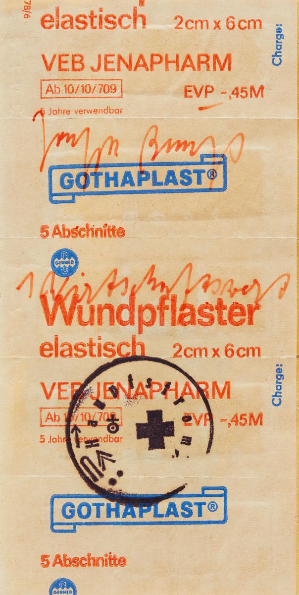 1 Wirtschaftswert (Wundpflaster). 1977. Päckchen Verbandspflaster, mit handschriftlichem Zusatz: 1 Wirtschaftswert und gestempelt: