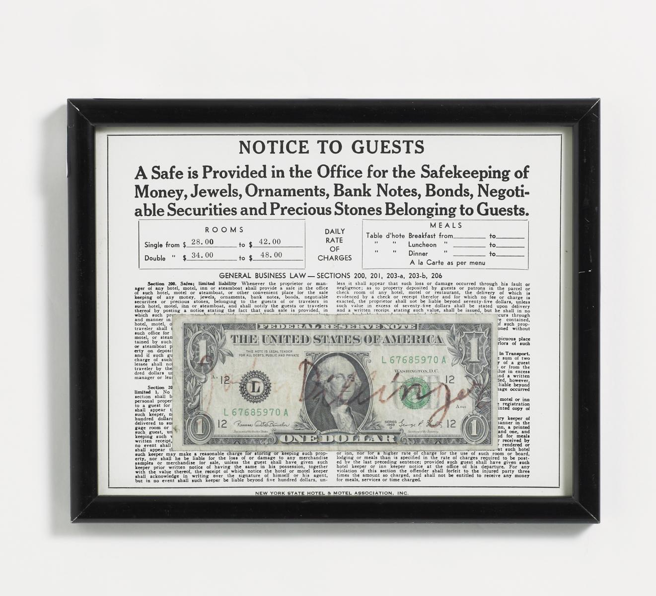 Notice to guests. Multiple. 1974. Offset auf Papier mit Dollar-Note, beschriftet. In Rahmen. 20,5 x 25,5 x 1,8cm. Ex.