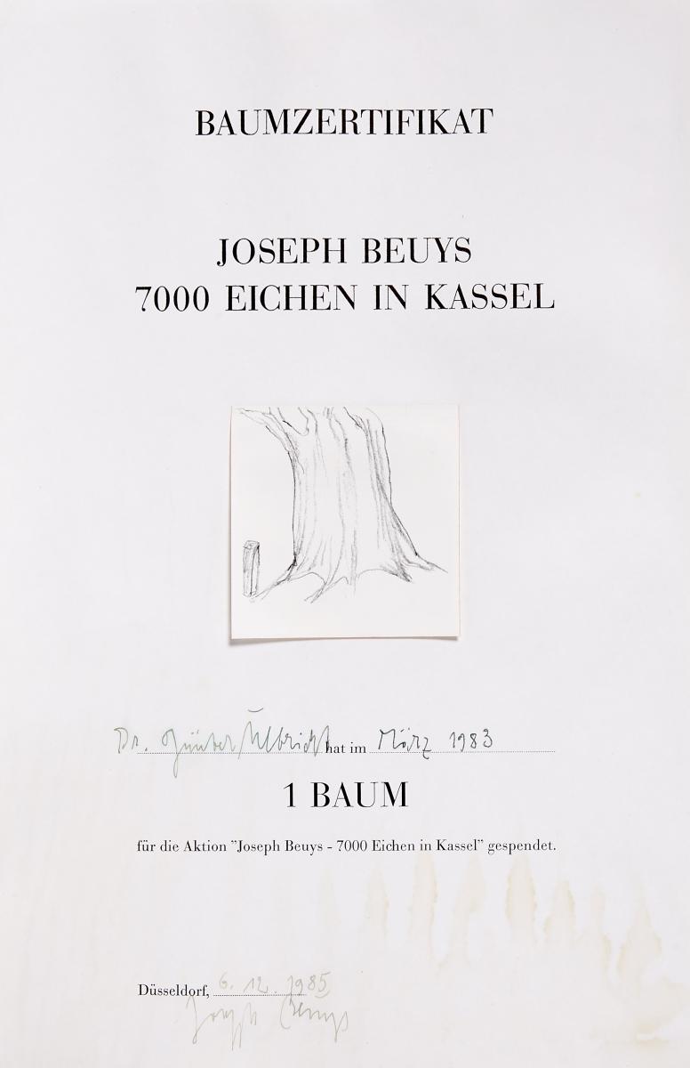 Baumzertifikat: Joseph Beuys - 7000 Eichen in Kassel. 1985. Formular-Druck auf festem Papier, mit einmontierter Zeichnungsreproduktion. 41,5 x 27cm. Datiert und signiert unten links: Düsseldorf, 6.12.1985, Joseph Beuys.