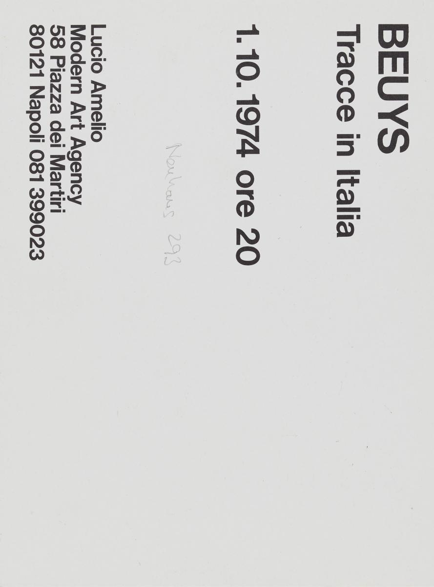 BEUYS - Tracce in Italia. Einladungskarte. 1974. Offset auf Karton. 20 x 15cm Signiert. Lucio Amelio, Neapel (Hrsg.). - Blatt etwas unfrisch.