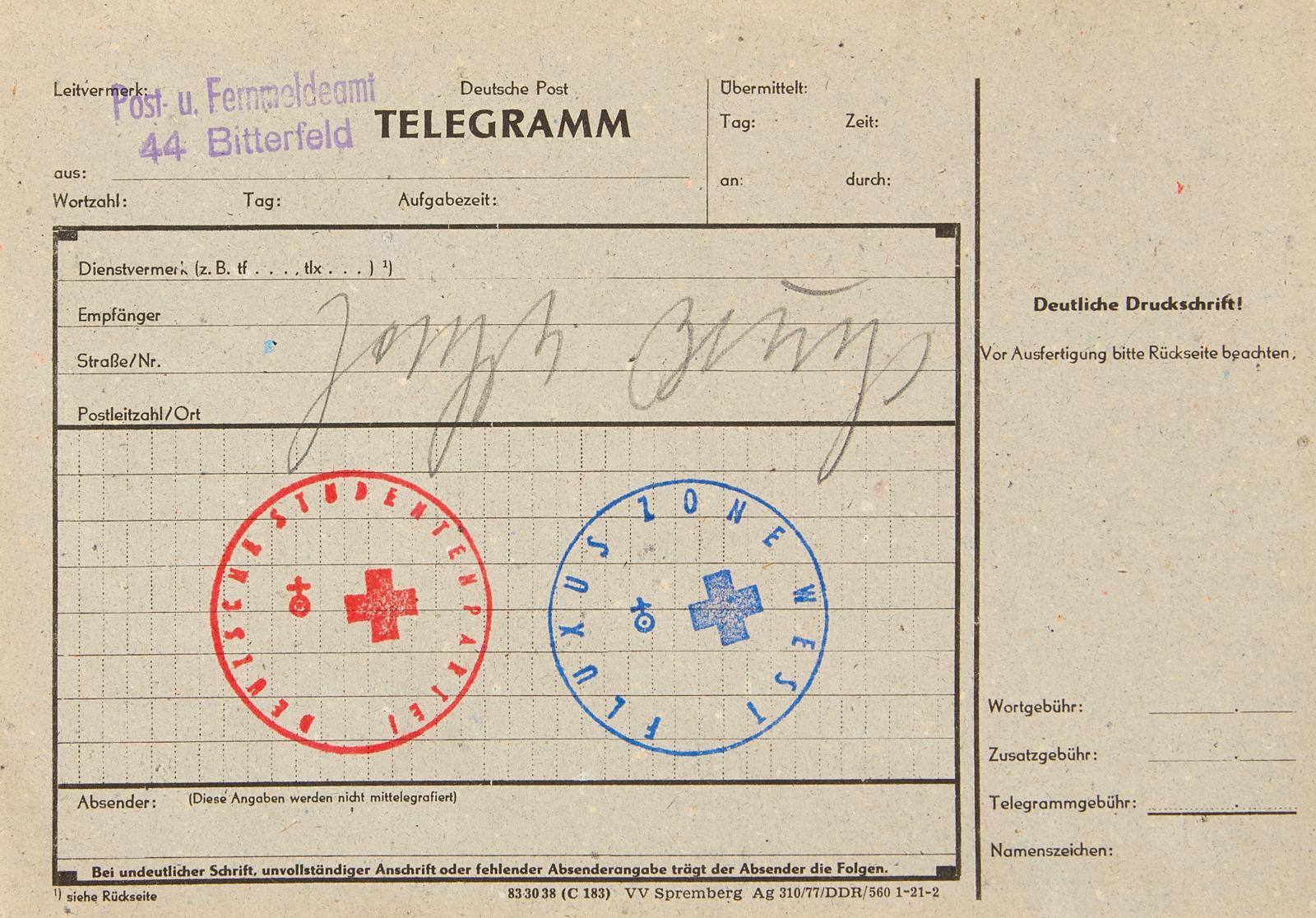 DDR Telegramm. Um 1977. Offset auf grauem Papier. 14,5 x 21cm Signiert und gestempelt (Deutsche Studentenpartei, Fluxus Zone West). - Blatt minimal gebräunt. Ansonsten in sehr gutem Zustand.