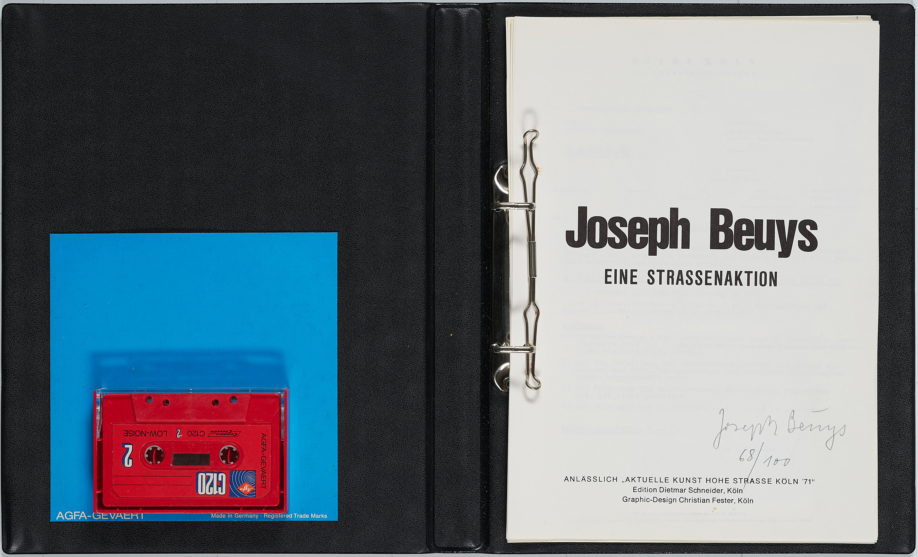 Eine Straßenaktion. 1972. Dokumentation und Tonbandkassette in Ringbuch, gestempelt. 31,5 x 25 x 3cm. Signiert und nummeriert auf Titelseite: Jospeh Beuys 68/100. Edition Dietmar Schneider, Köln (Hrsg.). Ex. 68/100.