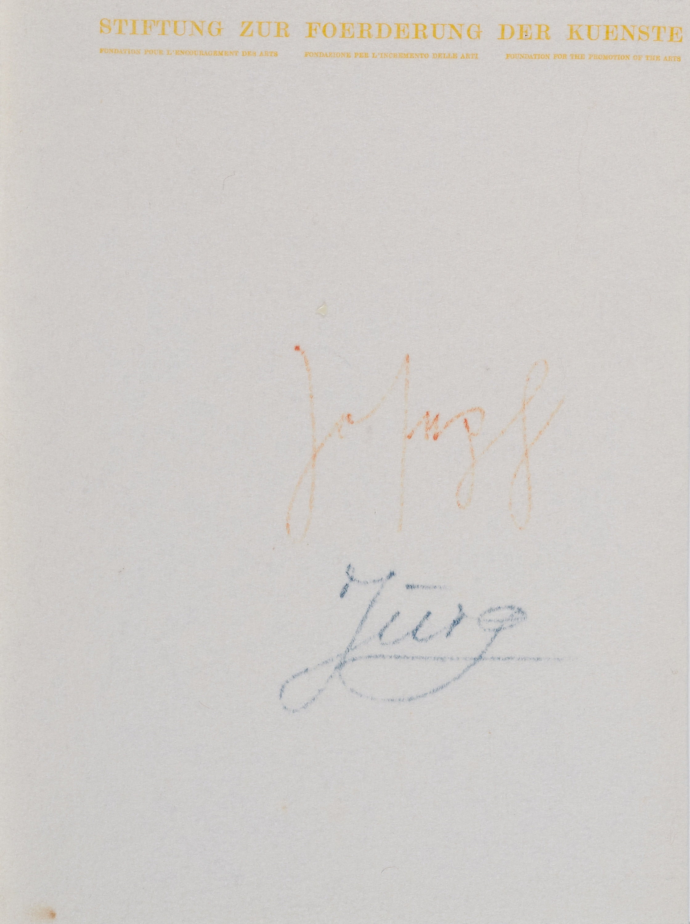 Filzbriefe. 1974. Fünf Stück weißer Filz. Jeweils mit typografischem Eindruck und von Joseph Beuys und Jörg