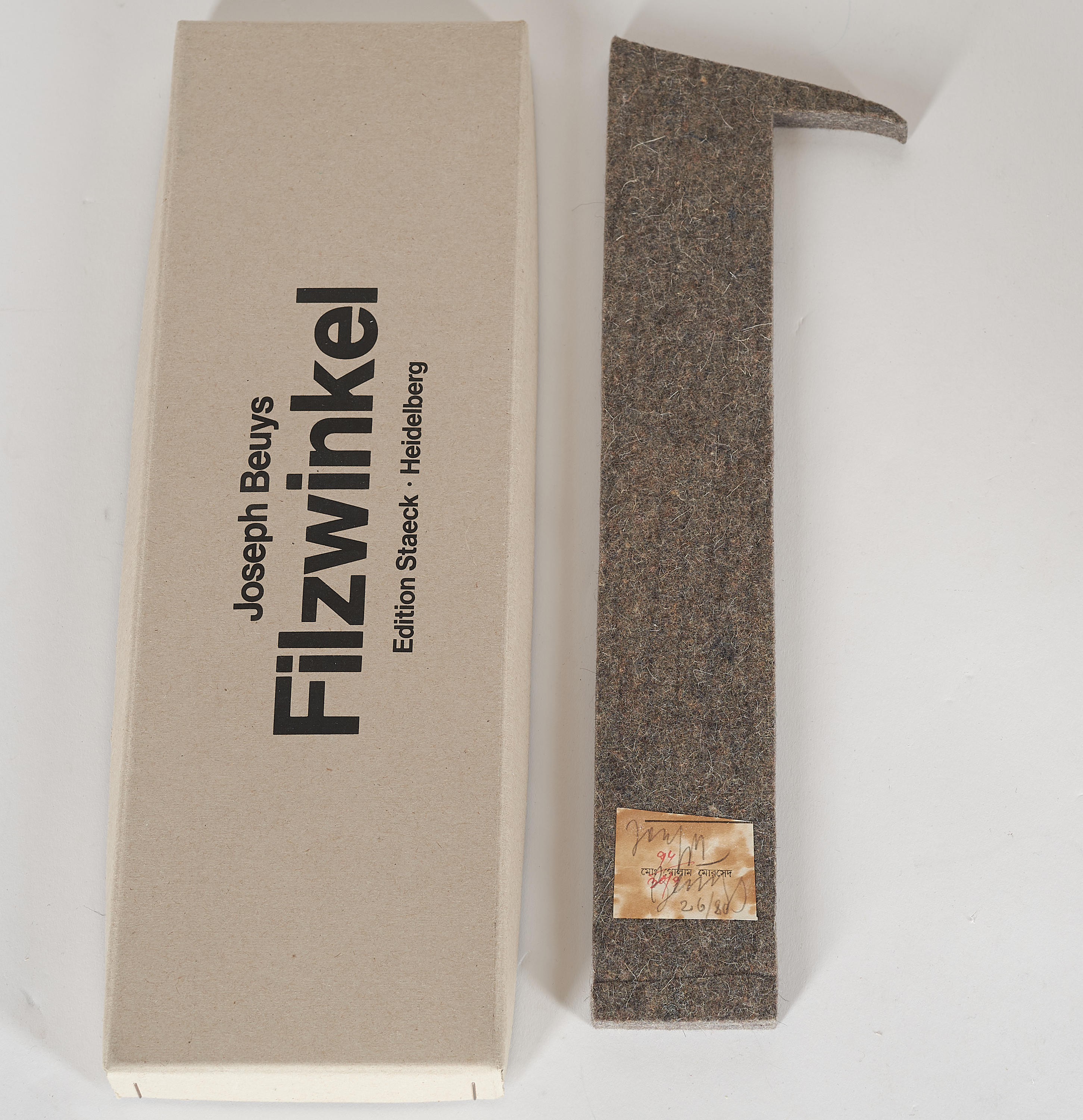 Filzwinkel. 1985. Filz, In bedrucktem Pappkarton. 36 x 10,5 x 1cm. Signiert und nummeriert verso auf Etiketten: Joseph Beuys 26/80. Edition Staeck, Heidelberg (Hrsg.). Ex. 26/80.