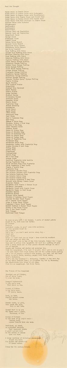 Food for Thought. 1977. Offset, Fettfleck und Stempel (Free International University) auf Maschinenbütten. 88 x 16cm Signiert. Freie Internationale Universität, Kassel (Hrsg.). Rahmen. - Verso großflächig montiert. Rahmen.