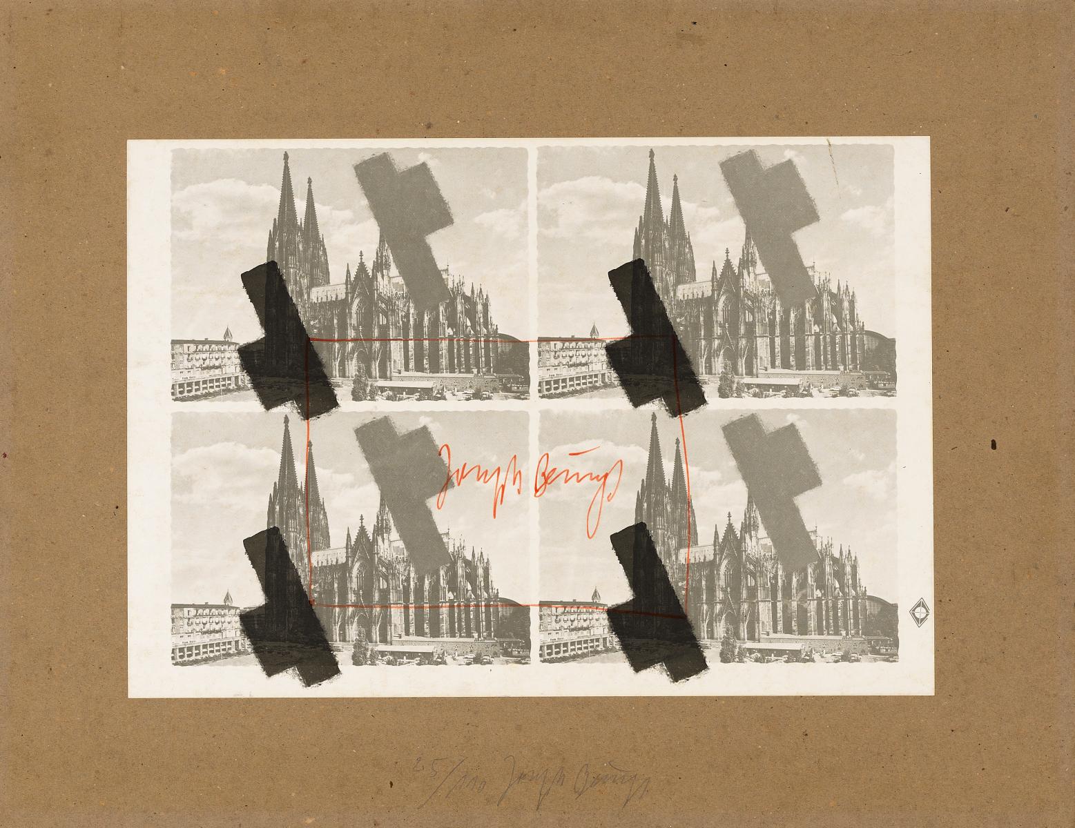 halbiertes Filzkreuz über Köln. 1977. Offset mit handschriftlichem Zusatz auf leichtem Karton auf Graupappe. 22,5 x 30cm (34 x 44,5cm). Signiert und nummeriert. Edition Staeck, Heidelberg (Hrsg.). Ex. 25/110. - Graupappe minimal gebräunt.
