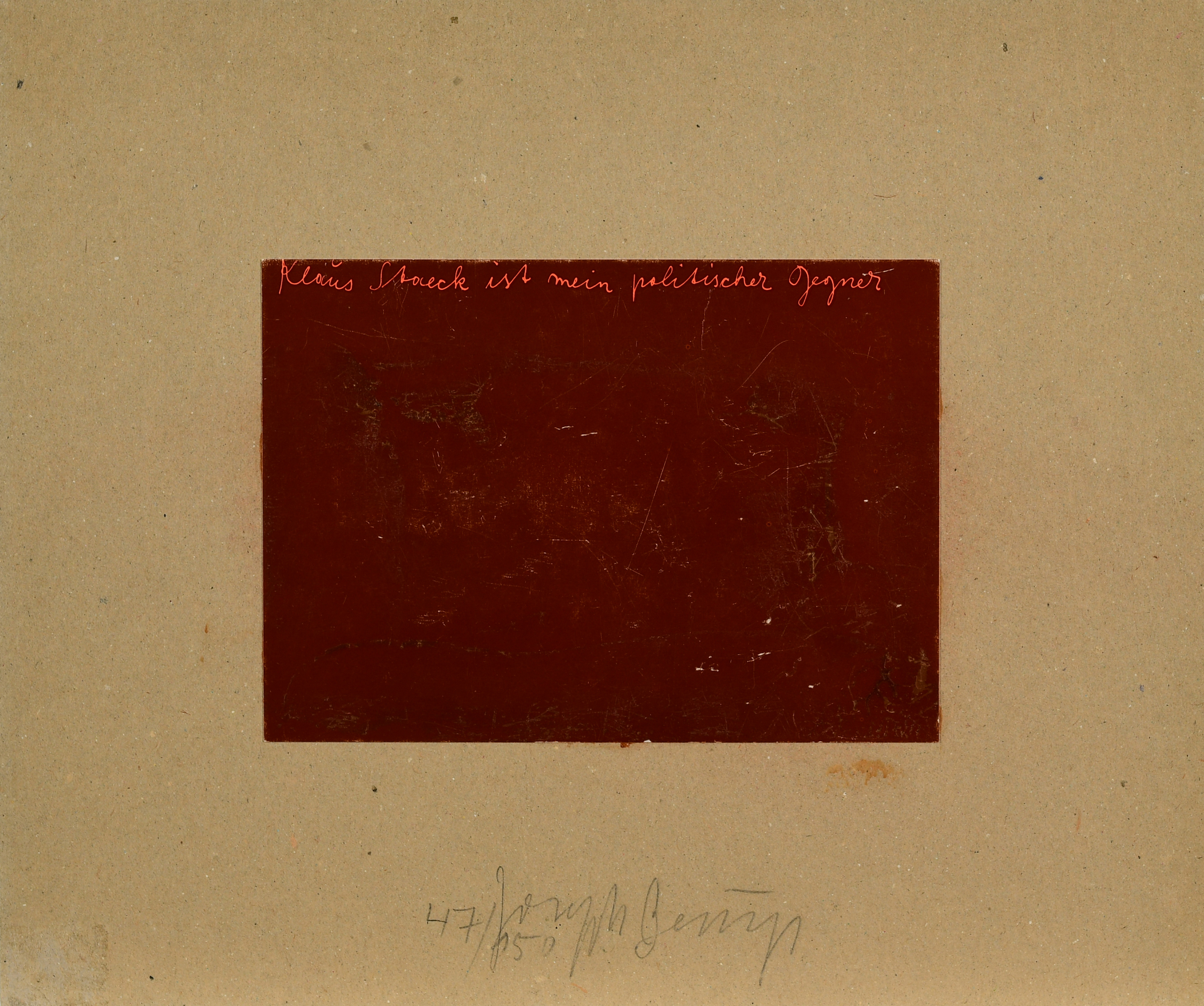 Klaus Staeck gebohnert. 1974. Schuhcreme auf Postkarte, auf Graupappe aufgezogen. 22,5 x 26,5 x 0,3cm. Signiert und nummeriert unten mittig: Joseph Beuys 47/150. Sowie auf Postkarte bezeichnet: Klaus Staeck ist mein politischer Gegner. Edition Staeck, Heidelberg (Hrsg.). Ex. 47/150.