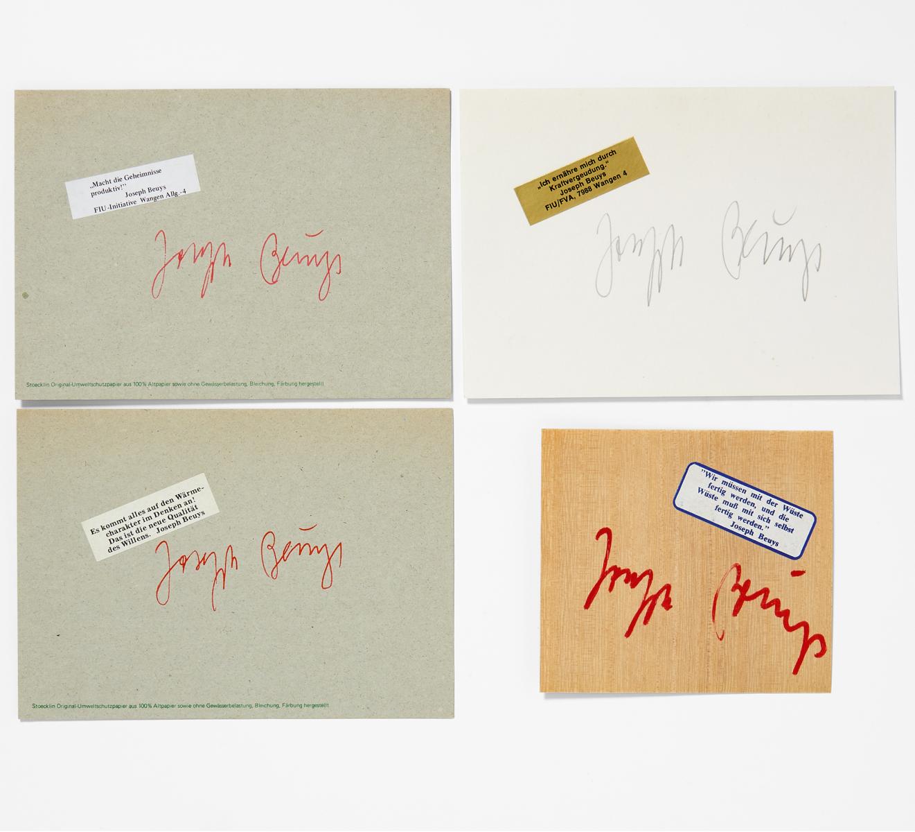 Konvolut. Vier Kartenmultiples. Jeweils: Collagen mit Textaufklebern. Signiert und nummeriert. a)-c) Auf leichtem Karton.