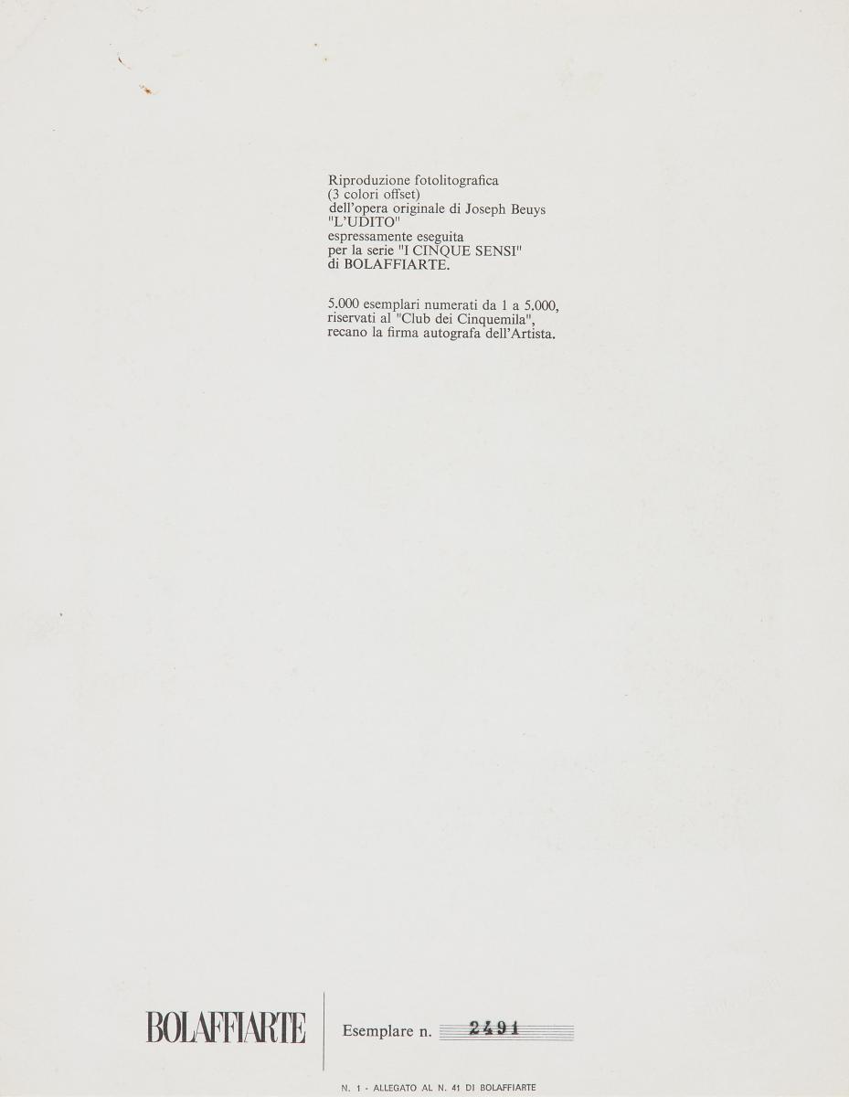 Konvolut L'udito. 1974. a) L´udito. Offset auf Büttenkarton. 19 x 19cm (29,5 x 23cm). Signiert, nummeriert (verso) und gestempelt (zweimal Hauptstrom). Bolaffi & Mondadori Editori, Turin (Hrsg.). Ex. 2491. - Leichte Knickspuren. Verso kleine Bräunungsflecken.