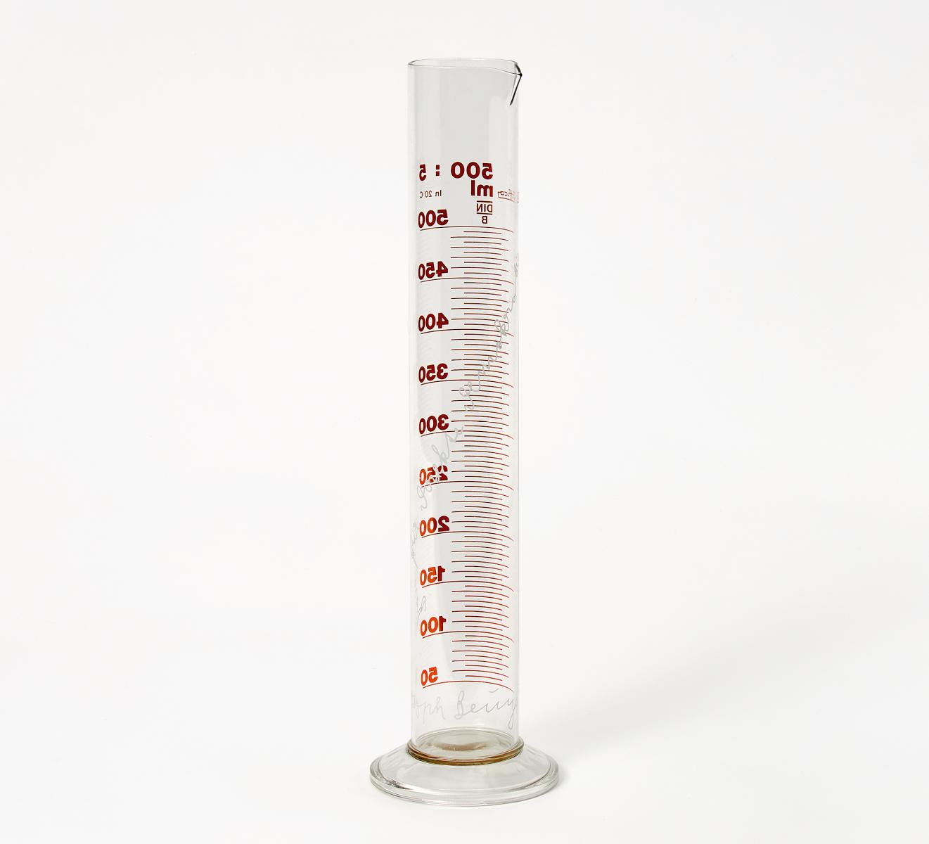 . a) Messzylinder aus Glas mit Schriftzug. 36 x Ø 9,5cm. Gestempelt, von Hand nummeriert und faksimilesigniert auf beiliegendem Zertifikat: Hauptstrom, 479, Joseph Beuys. Edition Staeck, Heidelberg (Hrsg.). Ex. 479.