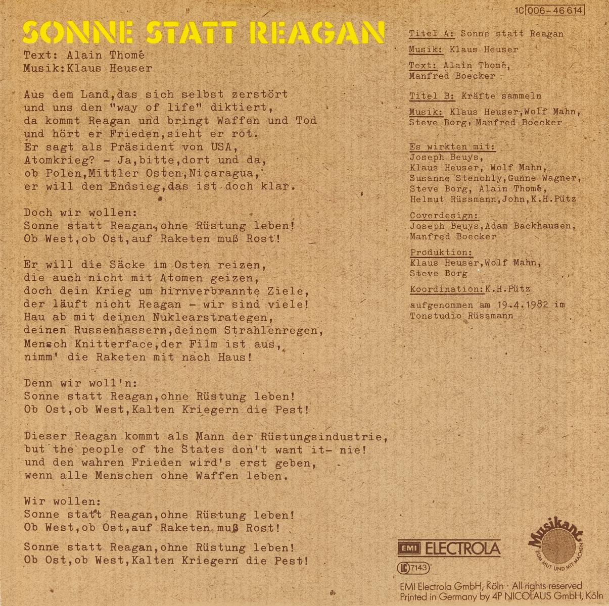 Sonne statt Reagan. 1982. 17cm-Schallplatte in Umschlag und Schutzhülle. 18,5 x 18,5cm.