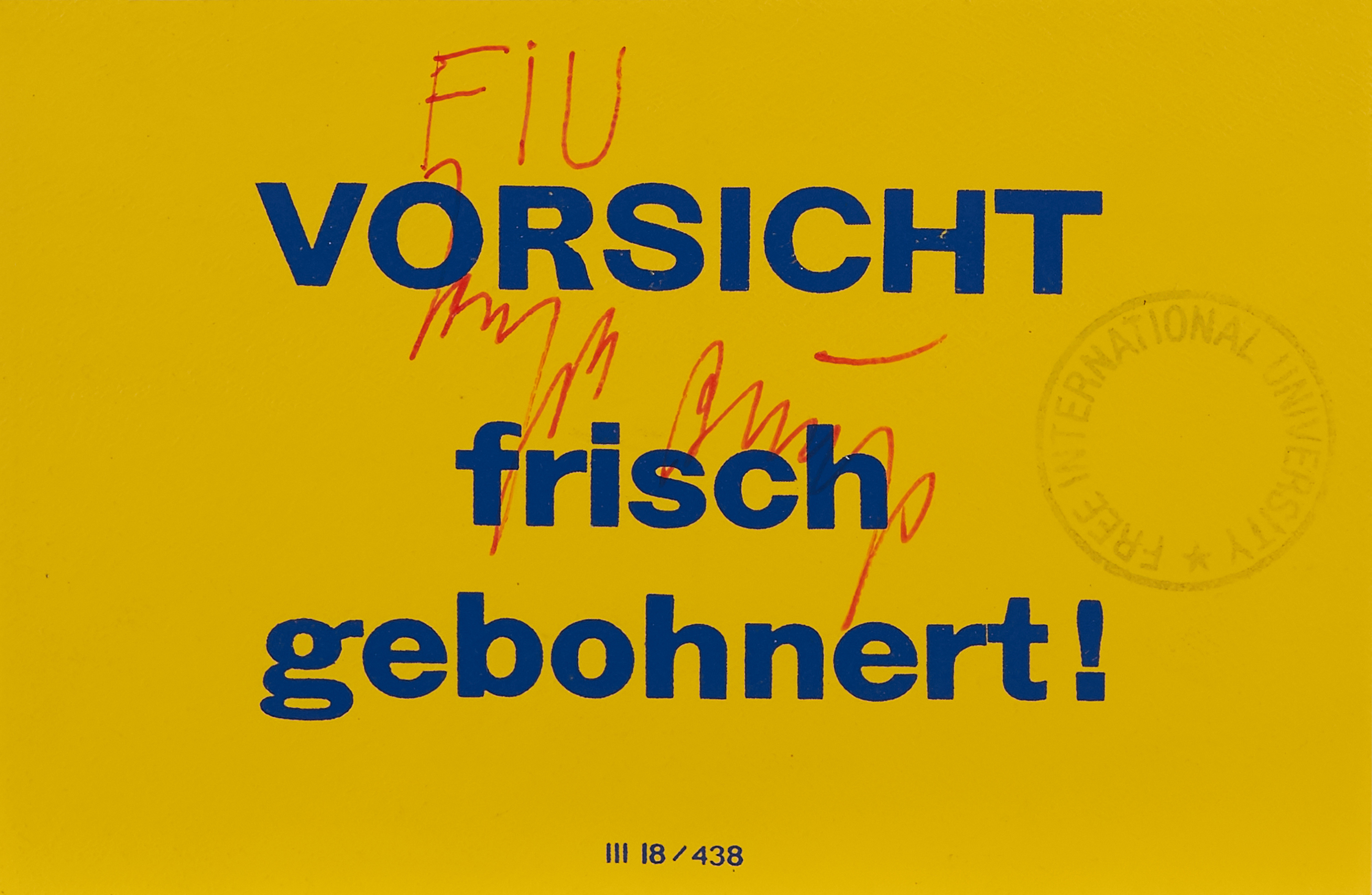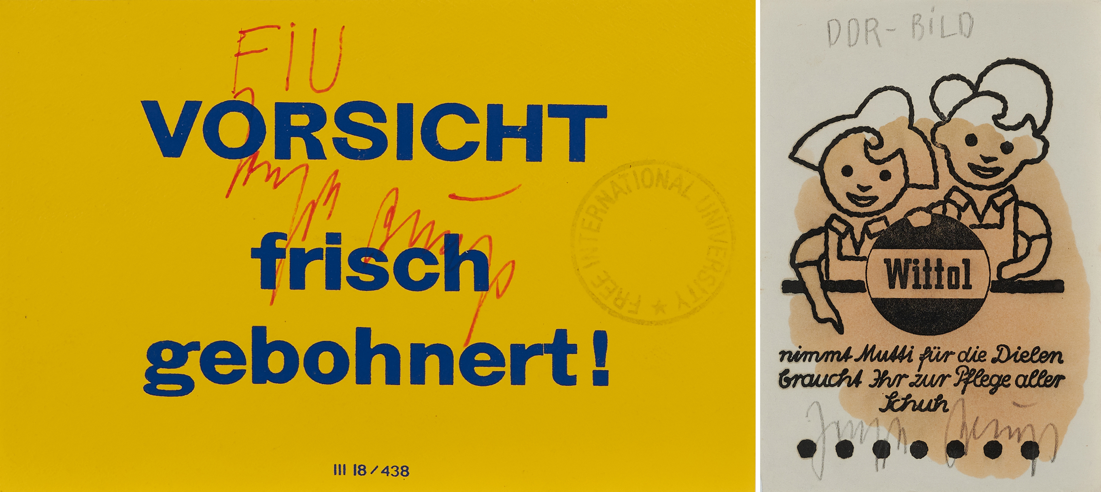 Konvolut von 2 Multiples. a) Vorsicht frisch gebohnert! Offset auf gelbem Papier mit handschriftlichem Zusatz.