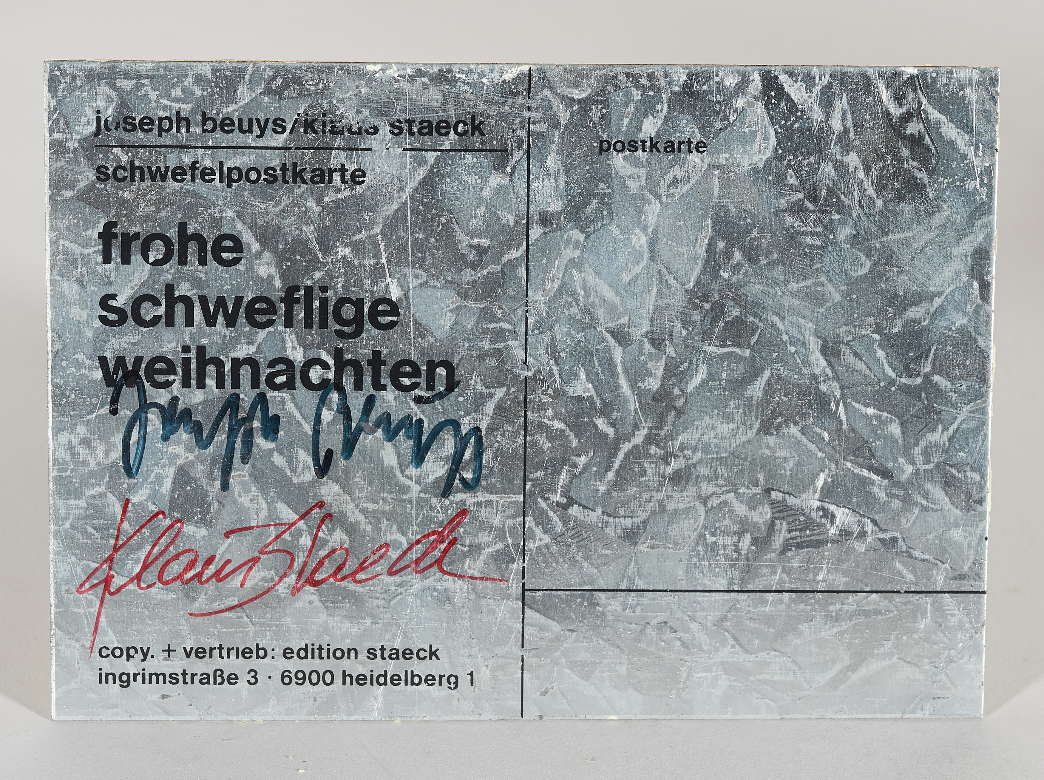 Schwefelpostkarte. 1984. Verzinktes Eisenblech, eine Seite mit Schwefel, eine Seite bedruckt. 10,5 x 15 x 0,2cm. Signiert verso links: Joseph Beuys, Klaus Staeck. Edition Staeck, Heidelberg (Hrsg.).