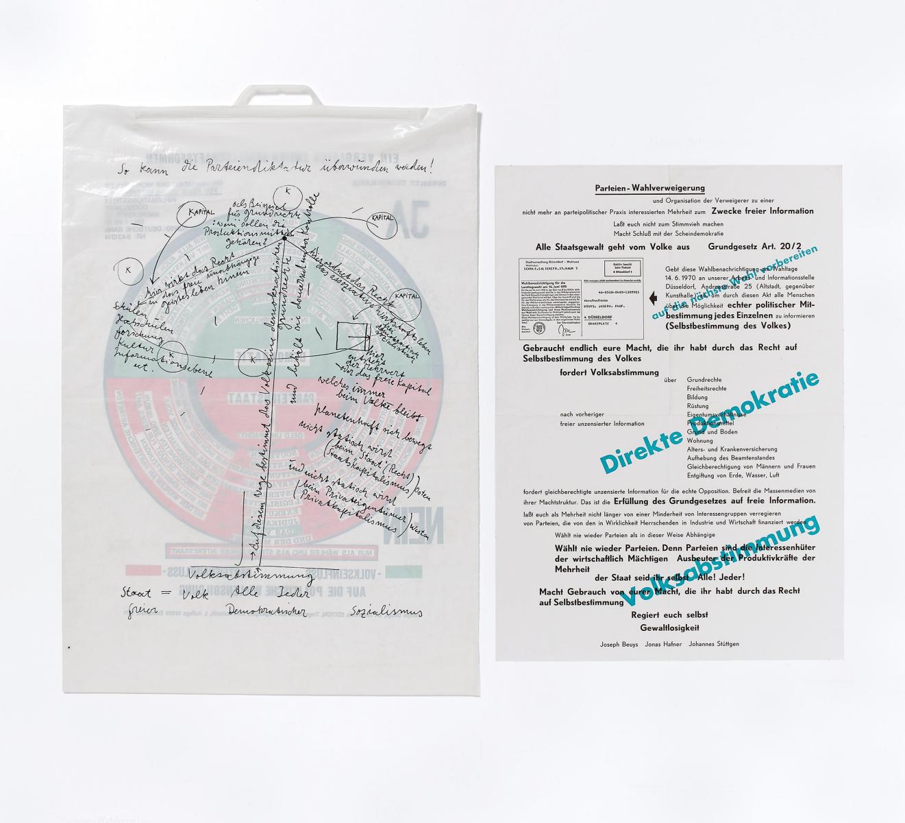"Parteien-Wahlvereinigung". Tasche: 75 x 52cm. Signiert oben links: Joseph Beuys. Plakat: