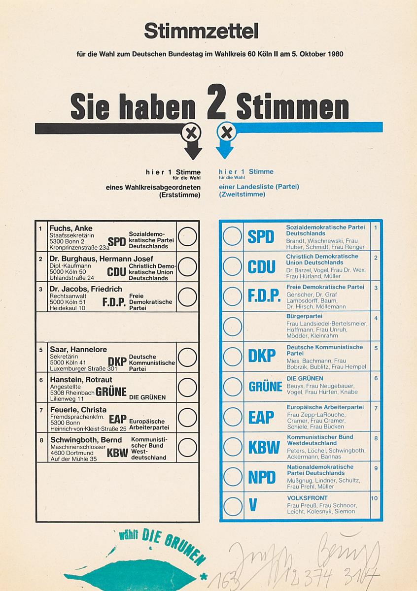 Stimmzettel. 1980. Stimmzettel zur Bundestagswahl, gestempelt. 30 x 21cm. Signiert, bezeichnet und nummeriert. art aktuell, Willi Bongard, Köln (Hrsg.). Ex. 163. Rahmen. - Blatt minimal gebräunt.