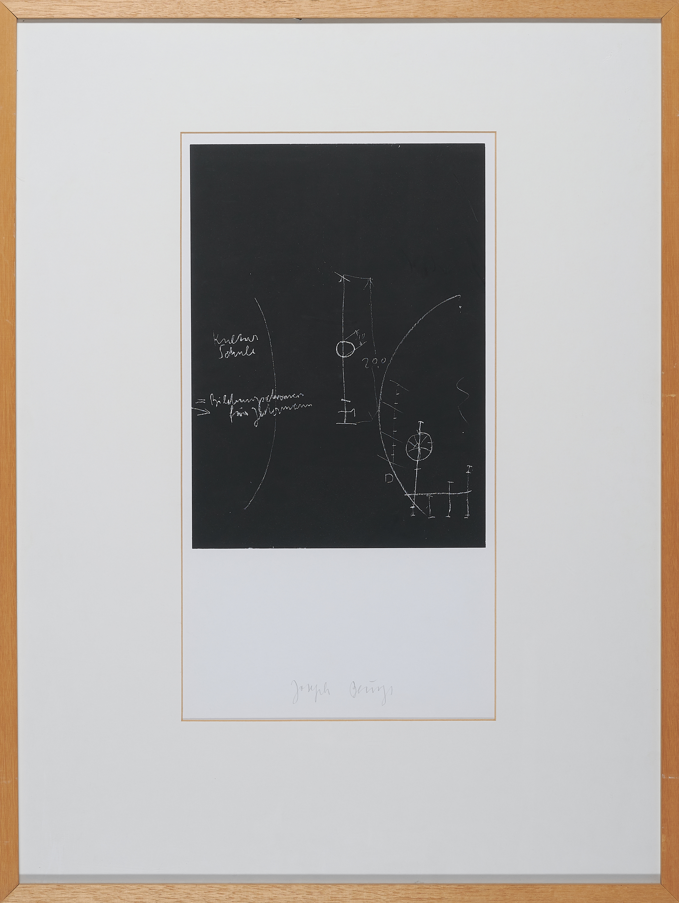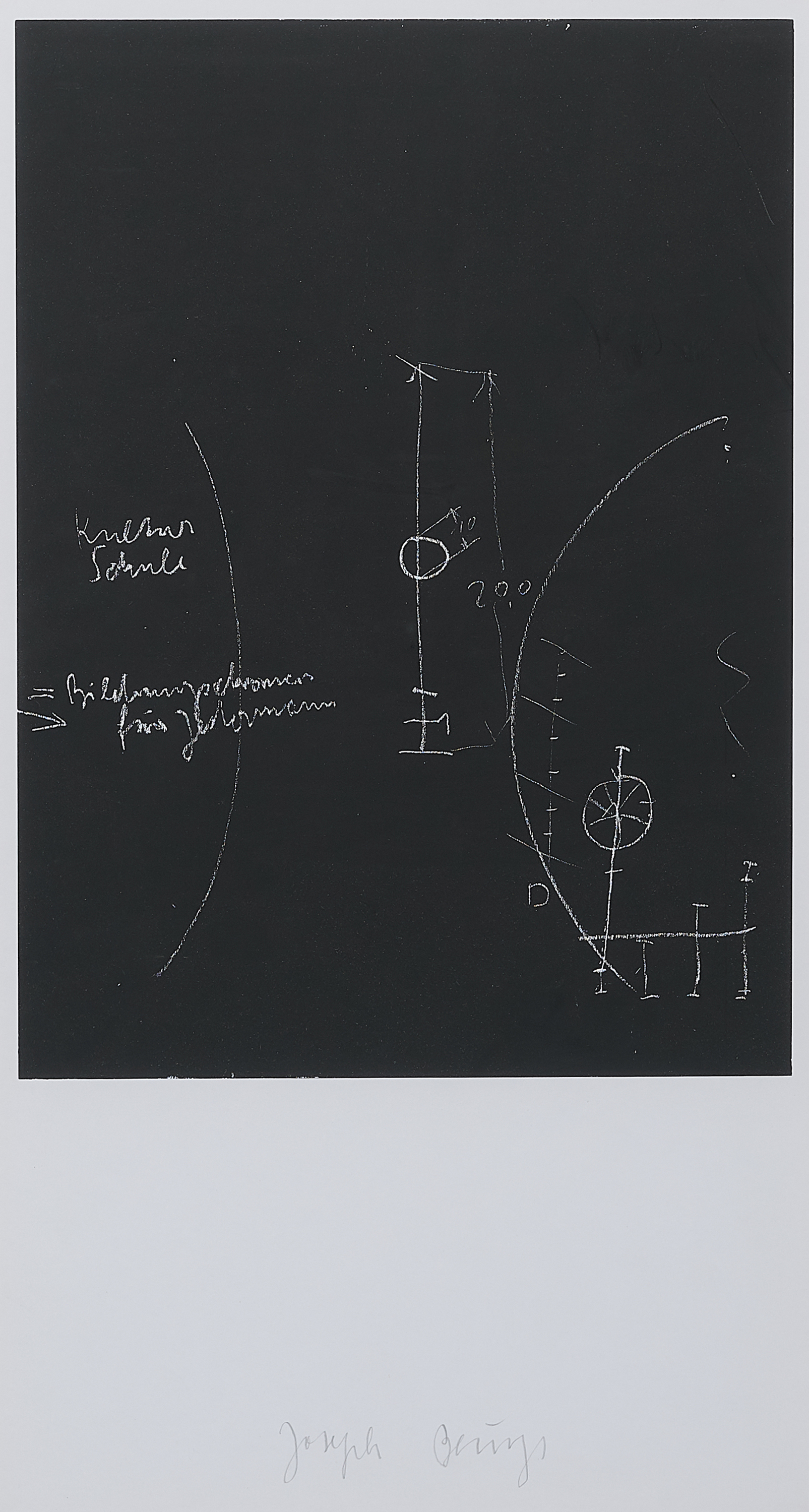 Aus der 3-teiligen Serie "Tafel", mit Motiven, die Beuys im Wintersemester 1974/75 an der Hamburger Hochschule für Bildende Künste als Gastprofessor an die Tafeln zeichnete. Aus einer Auflage von ca. 1.000 Exemplaren.