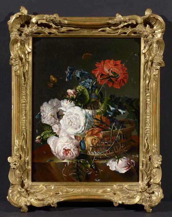 Zwei Gemälde mit Blumenstillleben. Das erste Stück der Pendants ist signiert und datiert unten links: J: Fischer 1788. Öl auf Leinwand. Doubliert. Jeweils ca. 40 x 30,5cm. Geschnitzter, vergoldeter Originalrahmen (?).