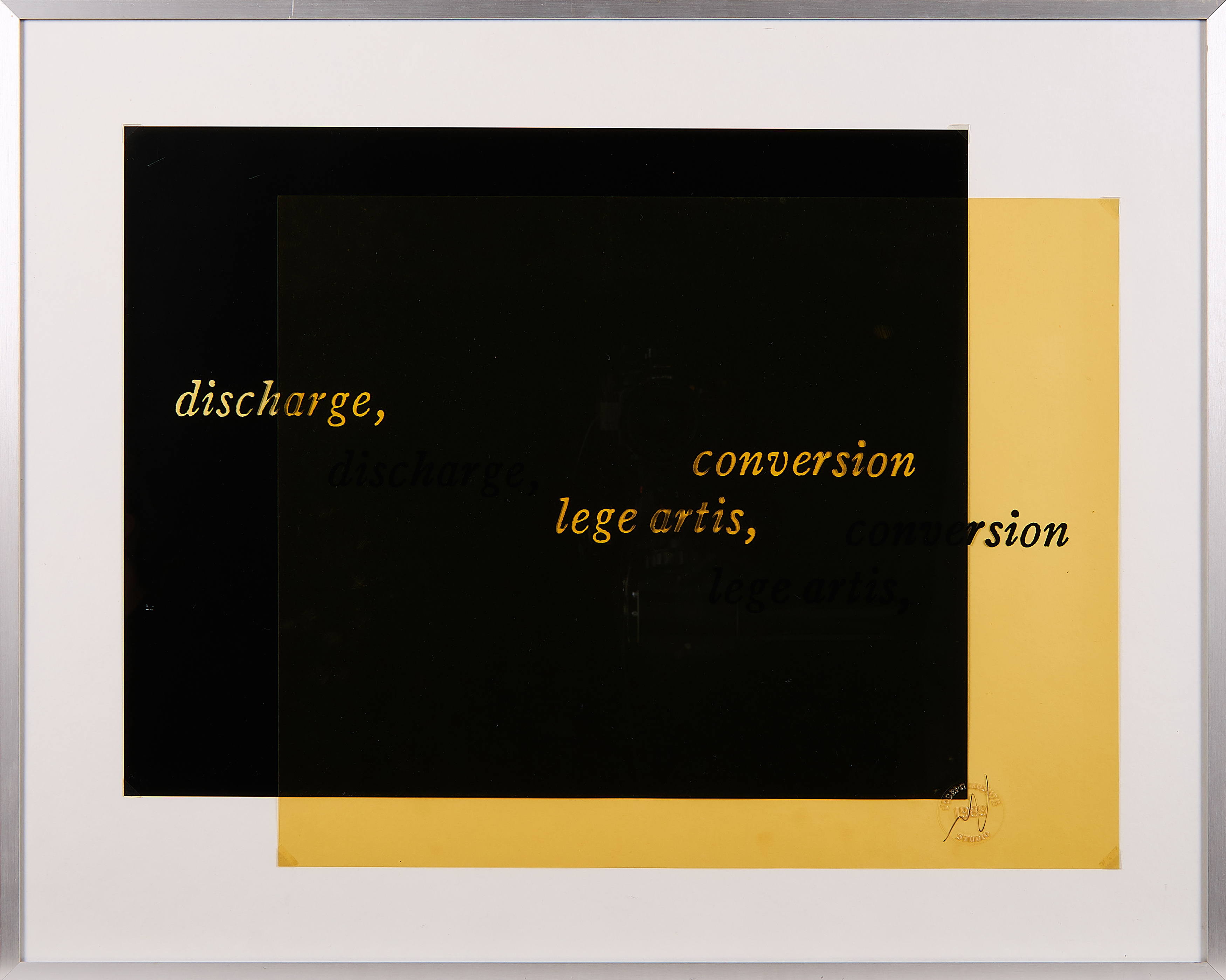 Technik: Farbserigrafie auf einer schwarzen und einer transparenten, gelben Folie, übereinander montiert.