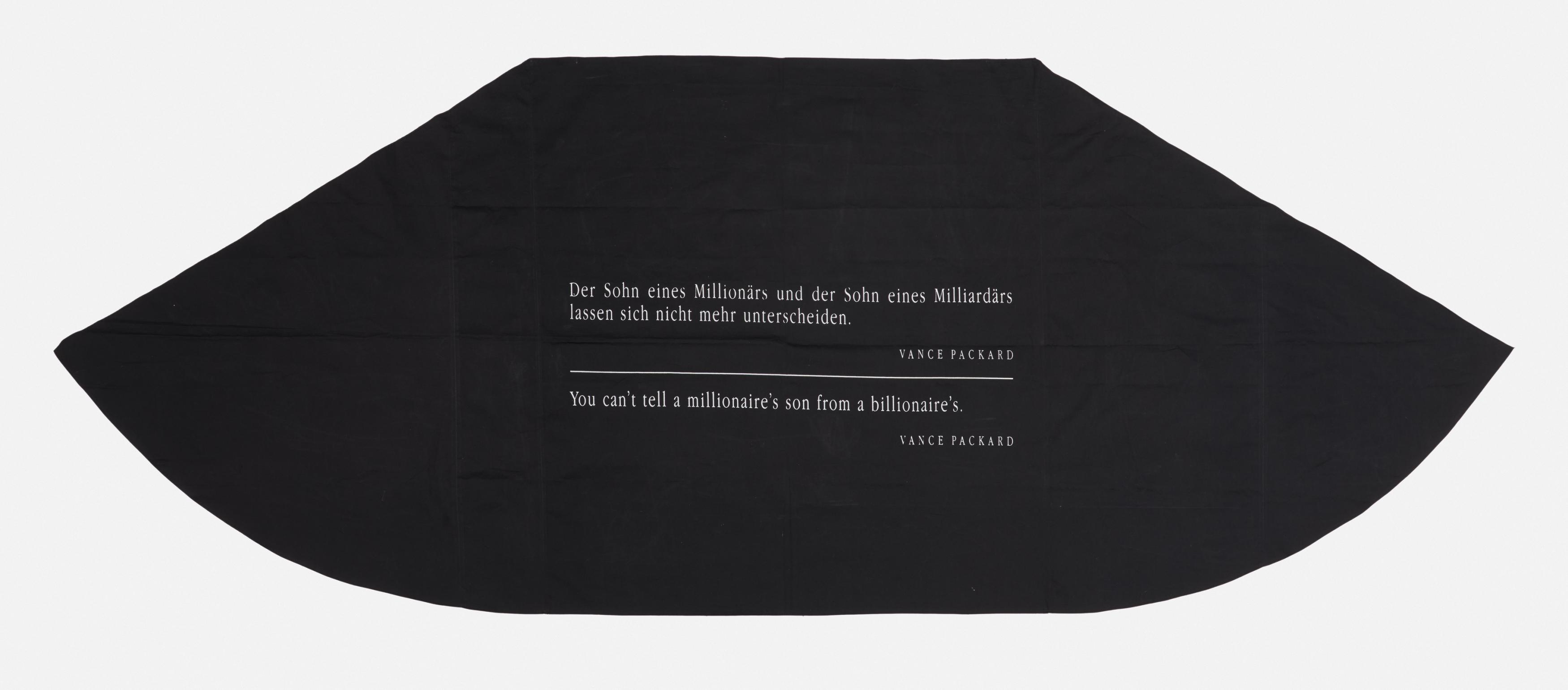 Der oval geschnittene Stoff ist bedruckt mit einem Zitat von Lance Packard in deutscher und englischer Sprache.