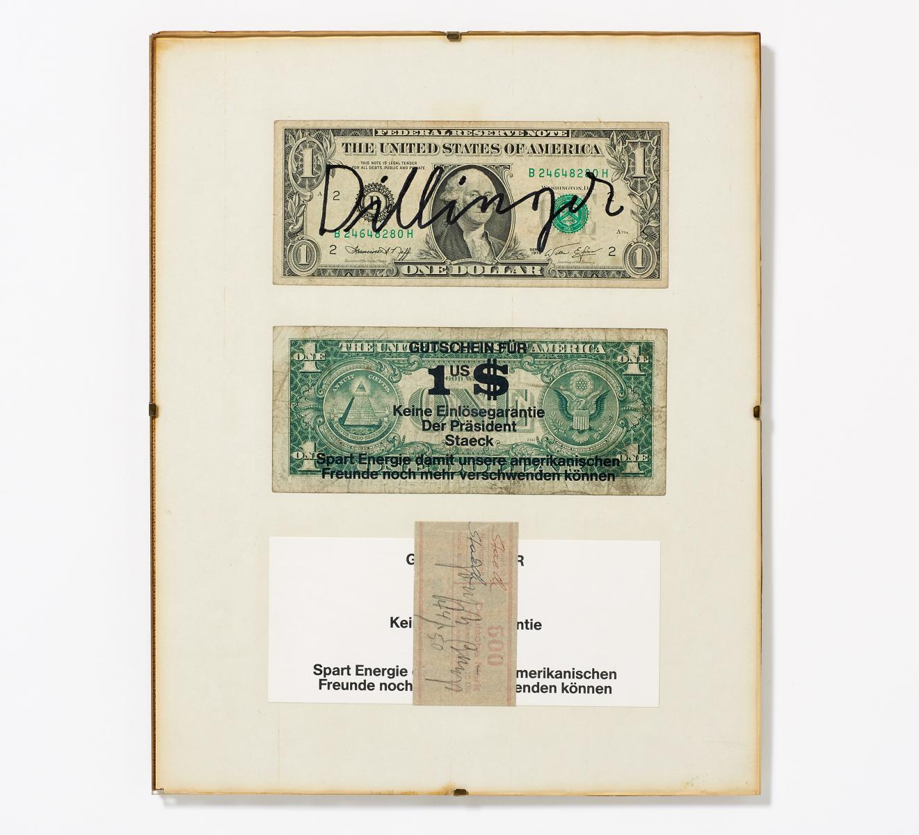 Dollarnoten. 1978. Zwei Banknoten und ein Textblatt. Eine beschriftet von Beuys. Eine bedruckt mit Text von