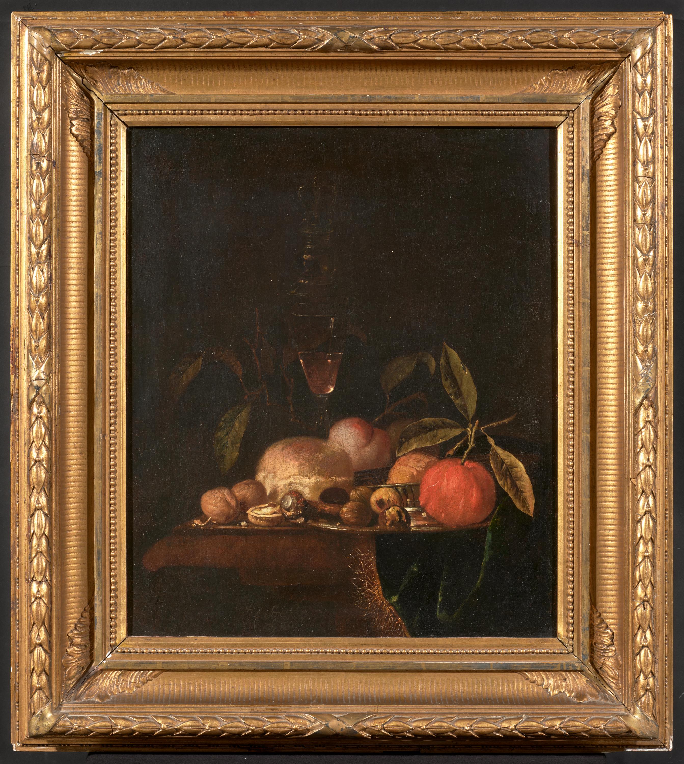 Titel: Stillleben mit einem gläsernen Deckelpokal, sowie Orange, Walnüssen und Brot auf einer Silberschale.