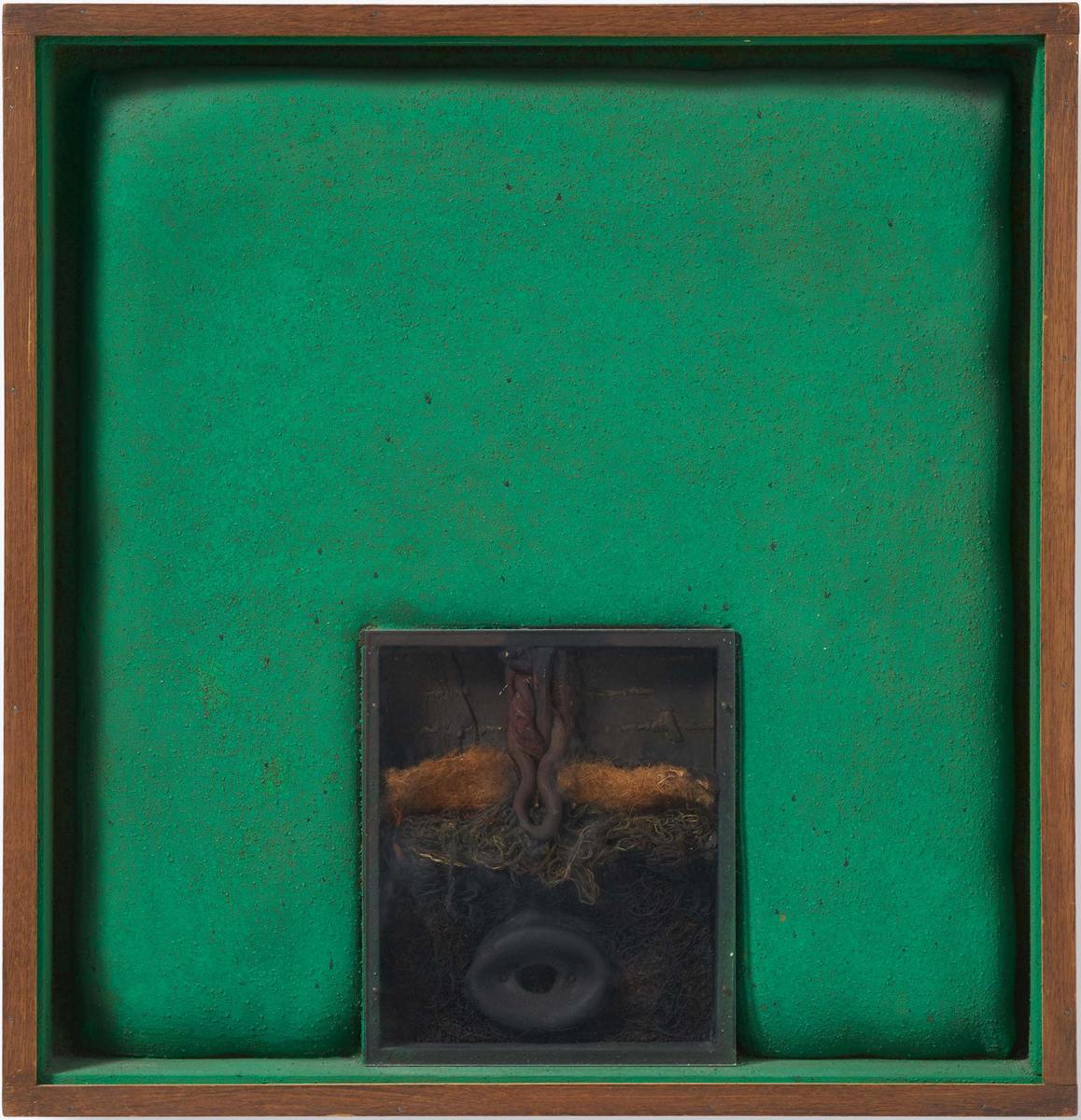 Technik: Mischtechnik (Textil, Metall, Holz, Fasern, Farbe) in Objektkasten..