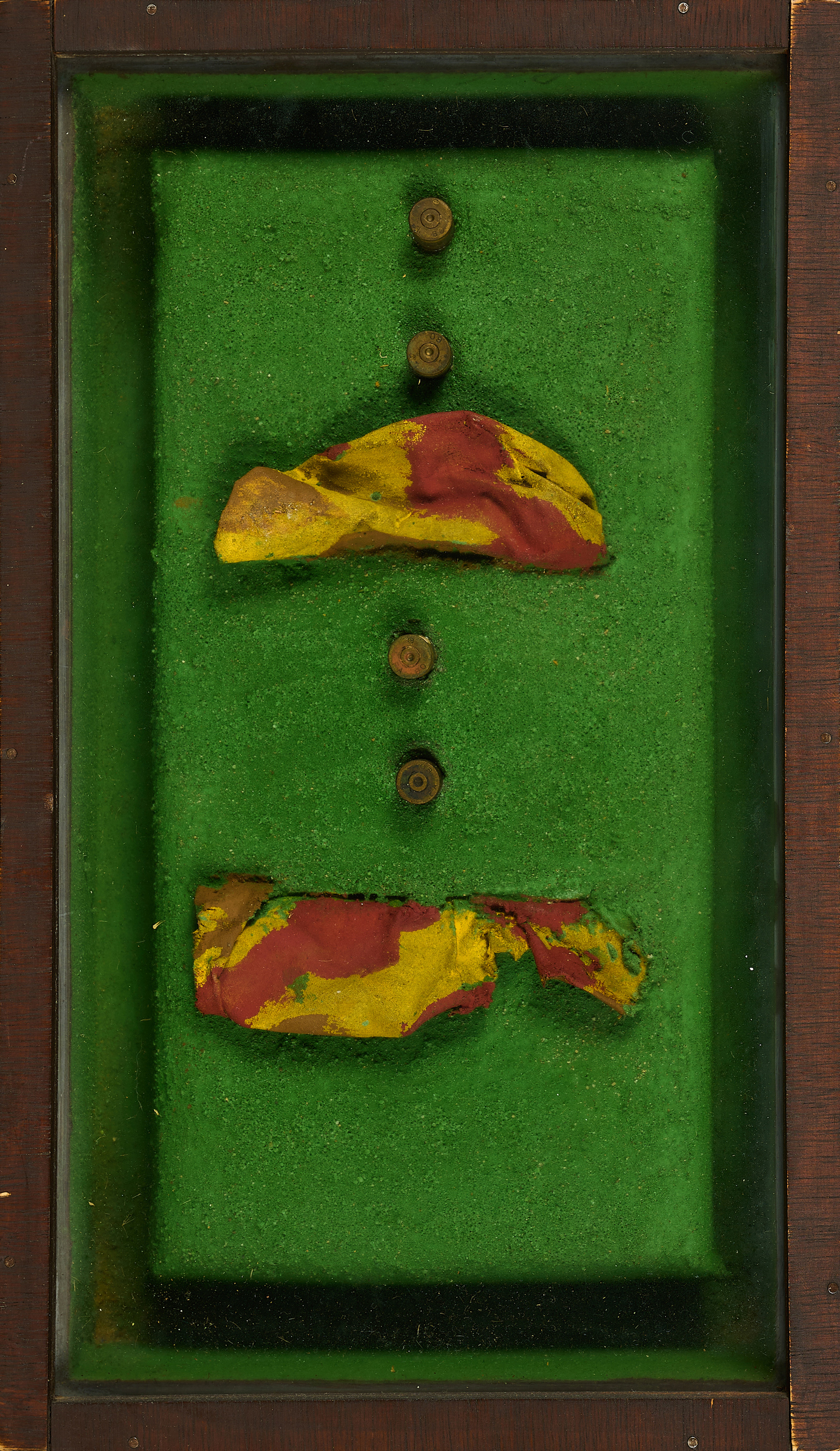 Technik: Objektkasten u.a. mit vier Patronenhülsen und verschiedenen z.T. bemalten Stoffen.