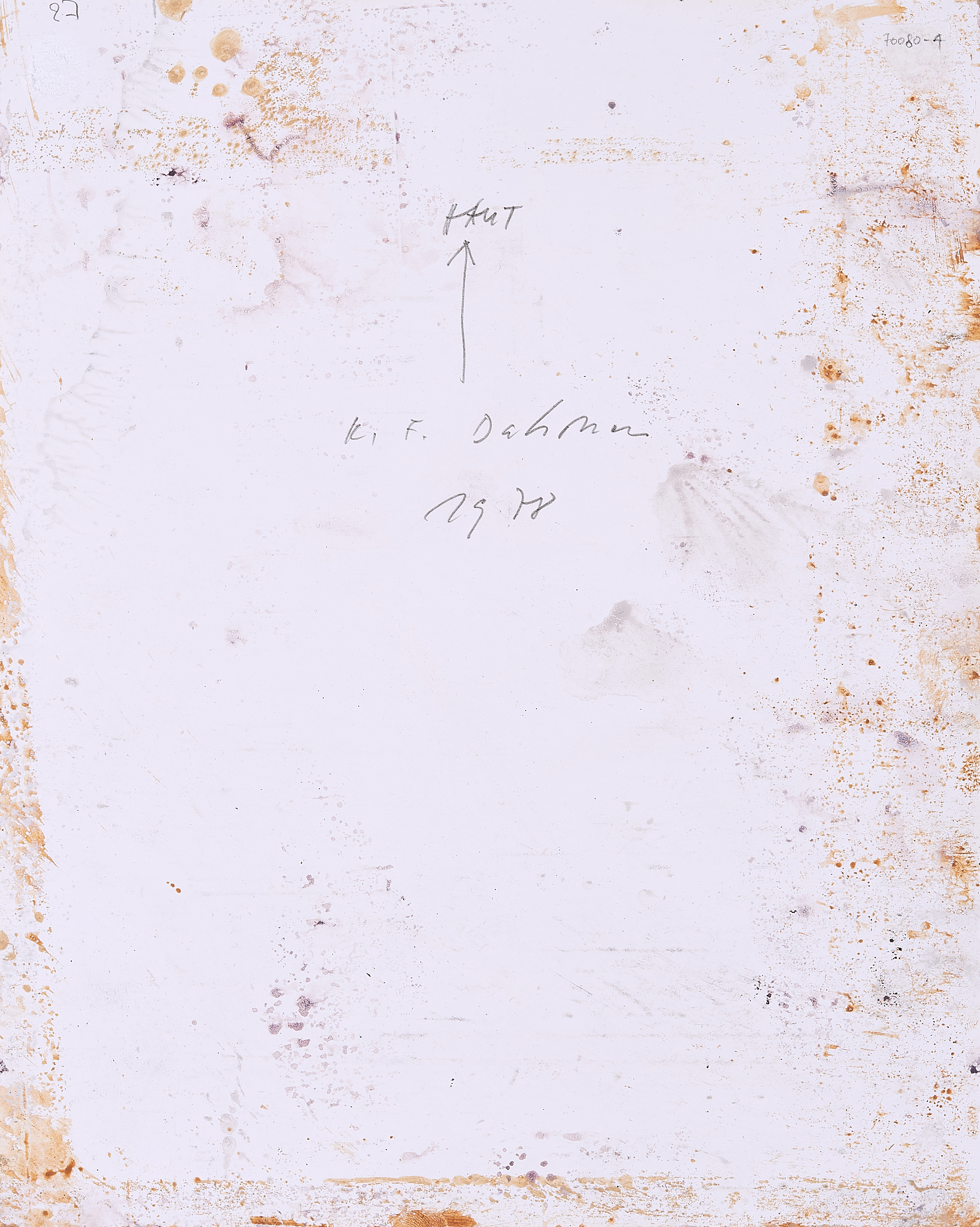 Bezeichnung: Signiert und bezeichnet oben mittig: Dahmen (unleserlich) 78. Sowie signiert, datiert, bezeichnet und mit Richtungspfeil versehen verso: HAUT K.F. Dahmen 1978.