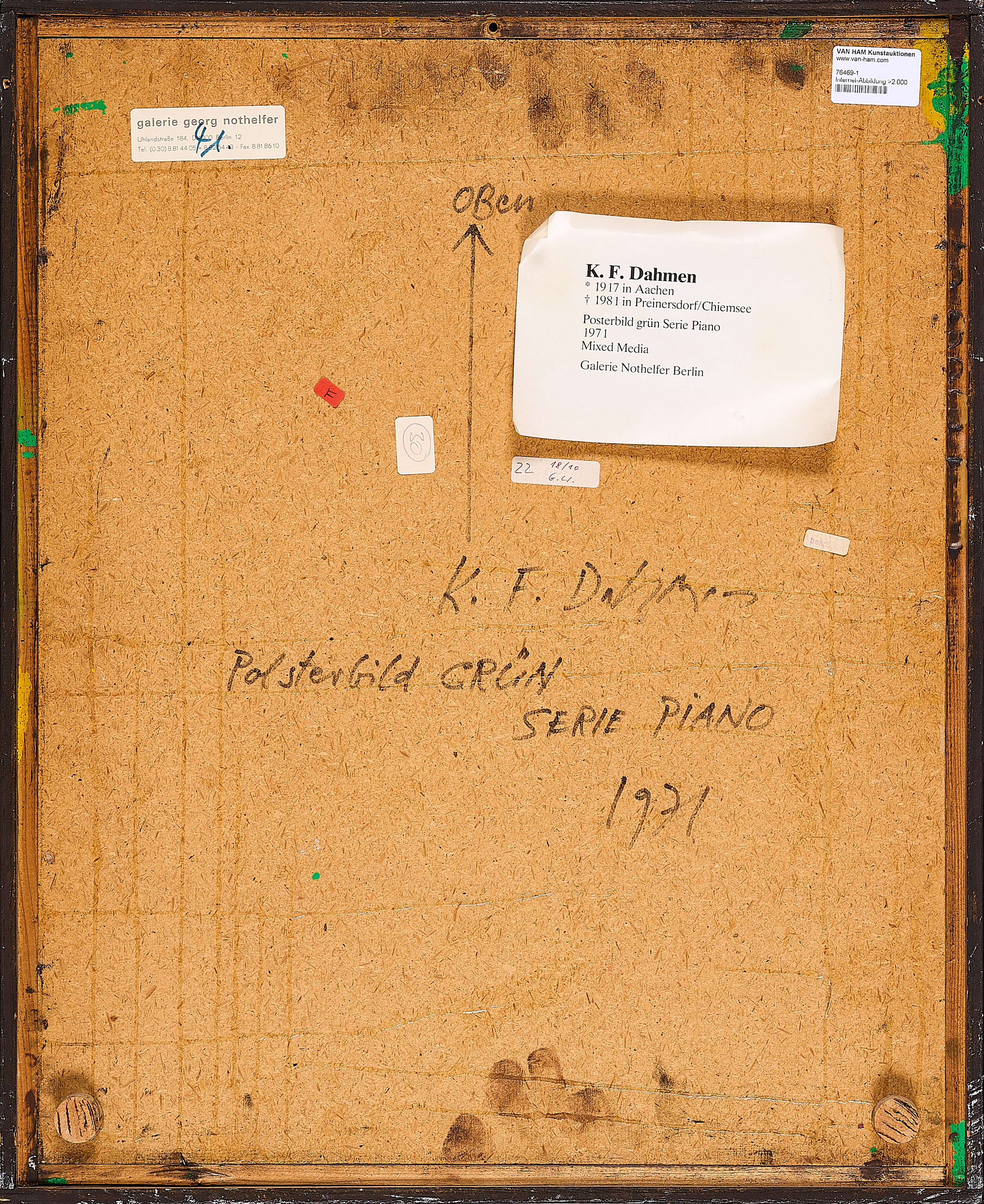 Bezeichnung: Signiert unten mittig: Dahmen. Signiert, betitelt und datiert verso: K.F. Dahmen Polsterbild GRÜN SERIE PIANO 1971.