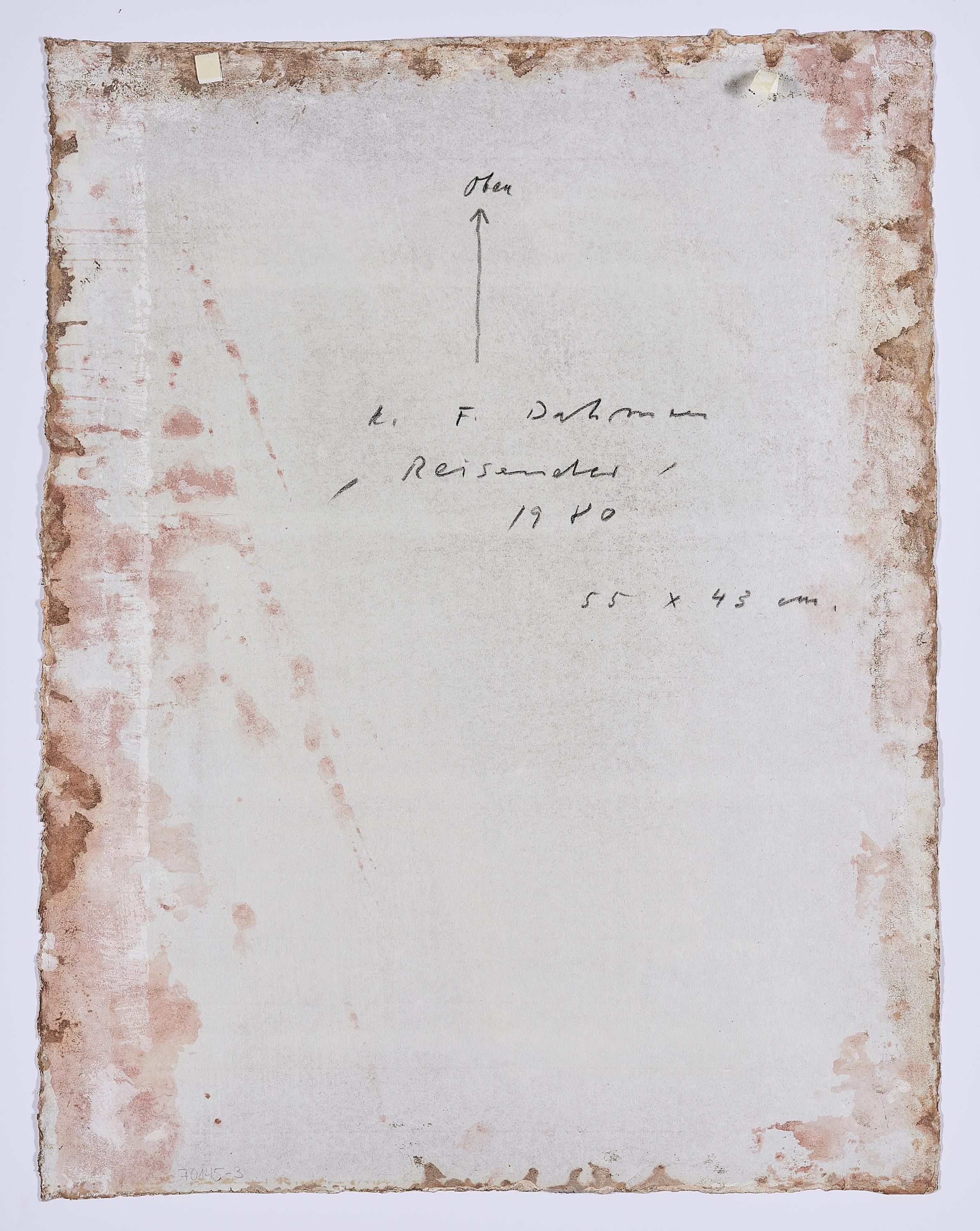 Bezeichnung: Signiert, betitelt, datiert und bezeichnet verso: K.F. Dahmen 'Reisender' 1980 55 x 43. Darüber mit Richtungsangabe versehen.
