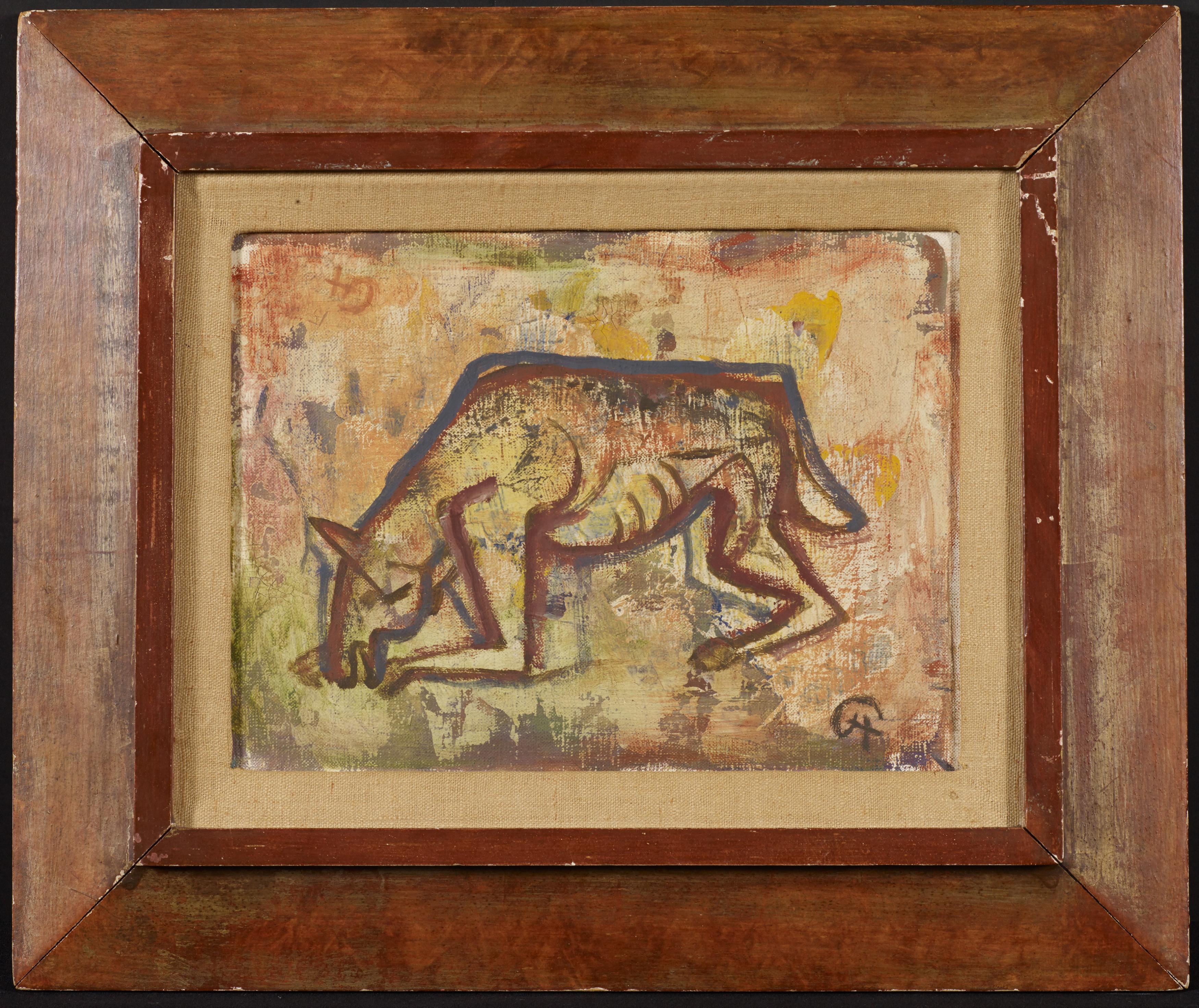 Karl Hofer hat in den frühen 1950er Jahren immer wieder seine beiden Hunde als Bildmotiv gewählt. Hierzu zählt auch unser kleines Gemälde. Dass er es als eine vollendete Komposition betrachtet und nicht etwa als eine Studie tut er mit dem setzen seines Monogramms unten rechts kund. Das zweite Monogramm oben links, das um 180° gedreht ist, weist daraufhin, dass Hofer wohl zuvor ein Ölbild auf der Leinwand gemalt hat, dann aber die Farbe abschabte, um ein neues anzufertigen - eben das Kleinod, was wir nun betrachten können..
