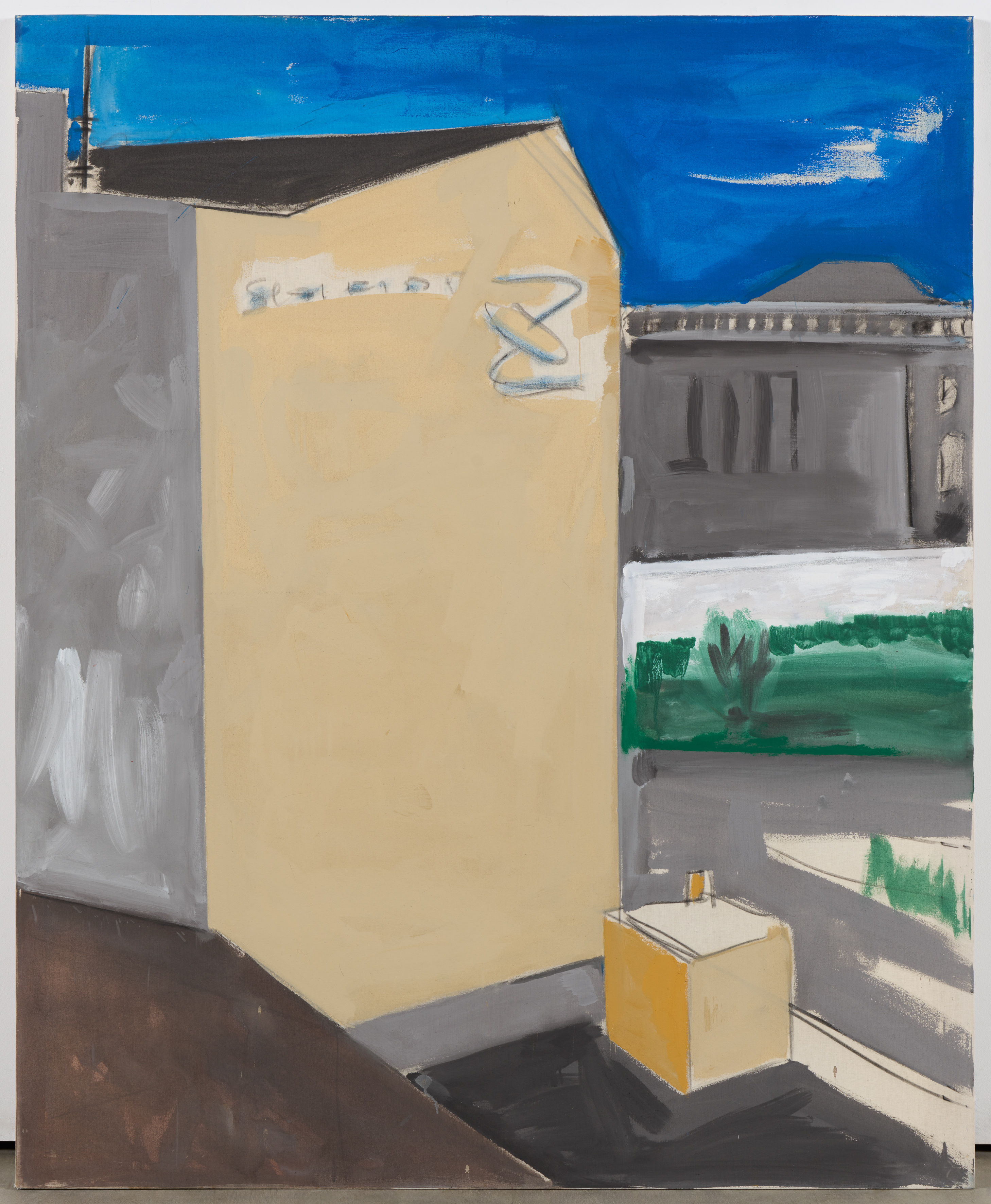 Das Bild zeigt den Blick aus Hödickes Atelier in der Dessauer Straße in Berlin. Das graue Gebäude im Hintergrund ist das heutige Abgeordnetenhaus.