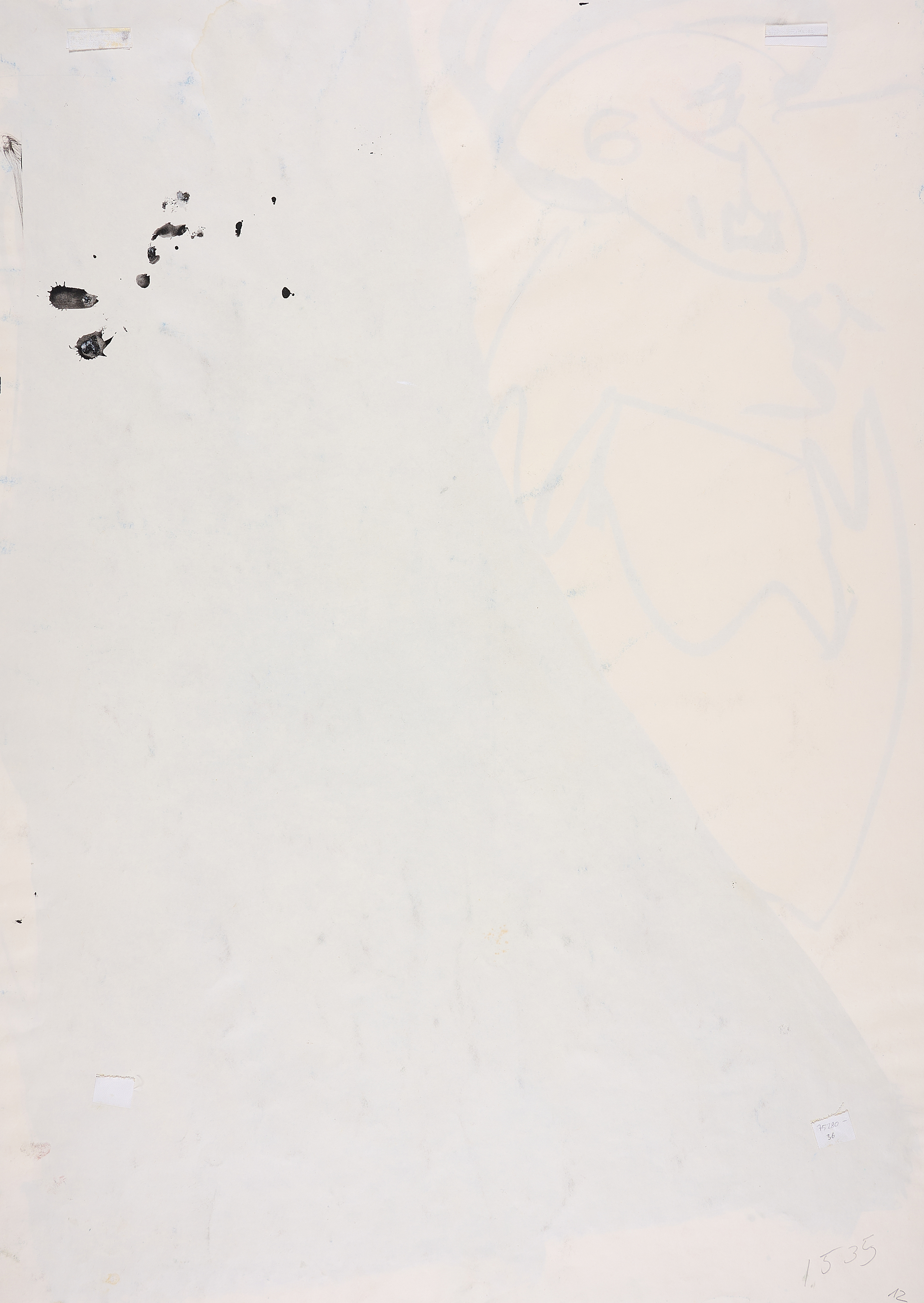 Herstellungsbedingt leicht gewellt. Zwei kleine Einrisse am Rand (jeweils ca. 0,4cm). Minimale Bestoßungen der Kanten. Verso Reste alter Montierung sowie Arbeitsspuren und minimale Verschmutzungen. Ansonsten guter Zustand.