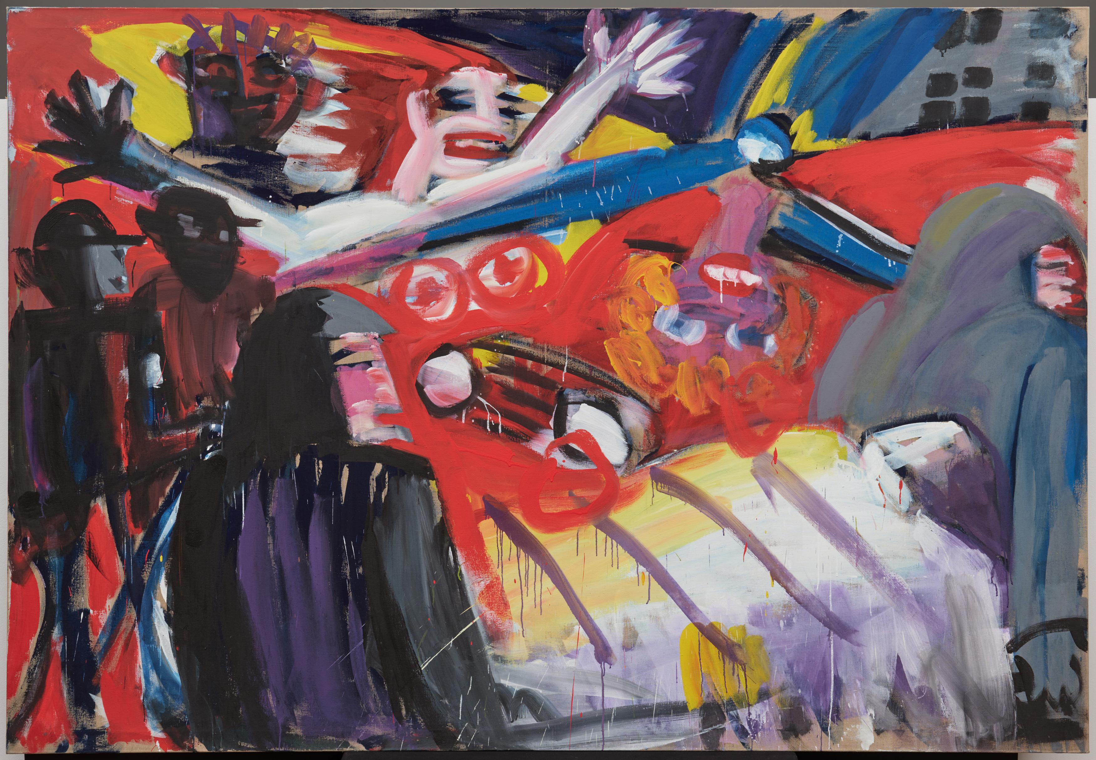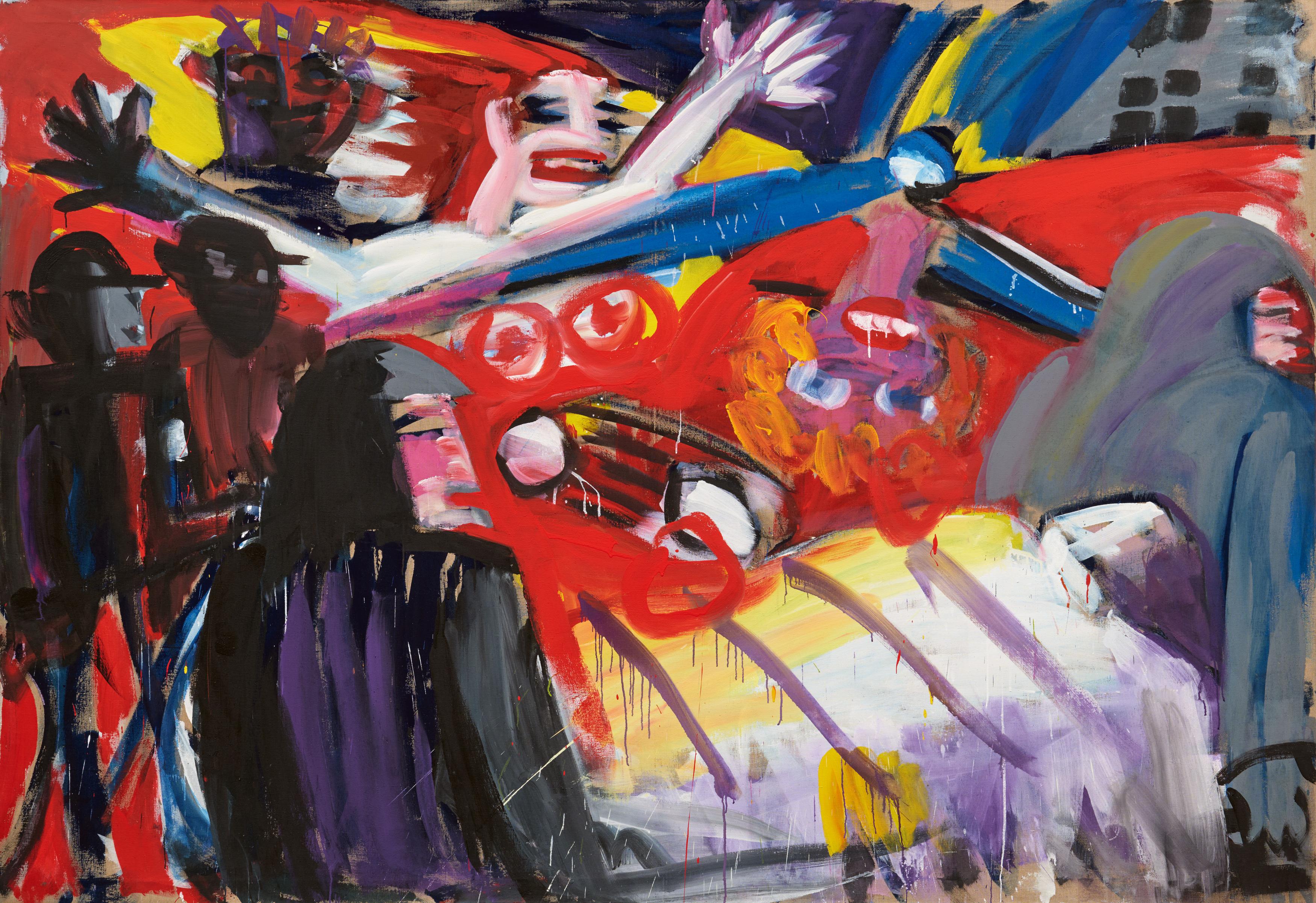 Das Gemälde "Szene nach dem Unfall" (1984) ist ein herausragendes Beispiel dieser kraftvollen Bildsprache. In eruptiver Farbigkeit und dynamischer Komposition entfaltet sich eine Momentaufnahme zwischen Chaos und Bewegung: Verzerrte Figuren, weit aufgerissene Münder, nach oben gestreckten Hände, grelle Rot- und Blautöne verdichten sich zu einem expressiven Tableau existenzieller Erschütterung. Hödicke erzählt nicht, er verdichtet - der "Unfall" wird zur Metapher für das menschliche Ausgeliefertsein an das Unkontrollierbare. Innerhalb seines Ouvres markiert das Werk einen Höhepunkt jener expressiven Phase der 1980er Jahre, in der Hödicke Farbe, Form und Emotion zu einem unmittelbaren Ausdruck verschmolz. Die Arbeit steht für die kompromisslose Unmittelbarkeit seines Schaffens - ein Sinnbild jener Intensität, mit der er die Wirklichkeit der Großstadt in reine Malerei verwandelte.