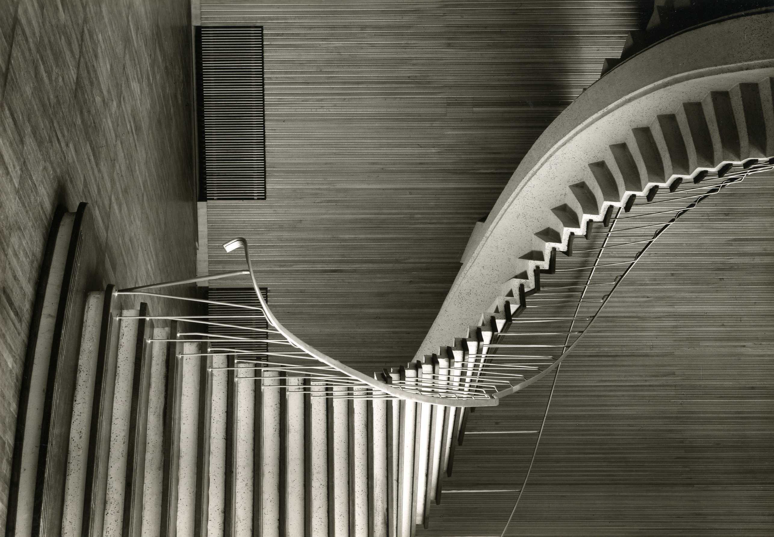 Funkhaus. Erdgeschossfoyer mit Treppe zum Obergeschossfoyer. 1952. Vintage. Gelatinesilberabzug auf Agfa-Portriga. 22 x 15,5cm Verso Atelierstempel des Fotographen sowie als Rohabzug bezeichnet.