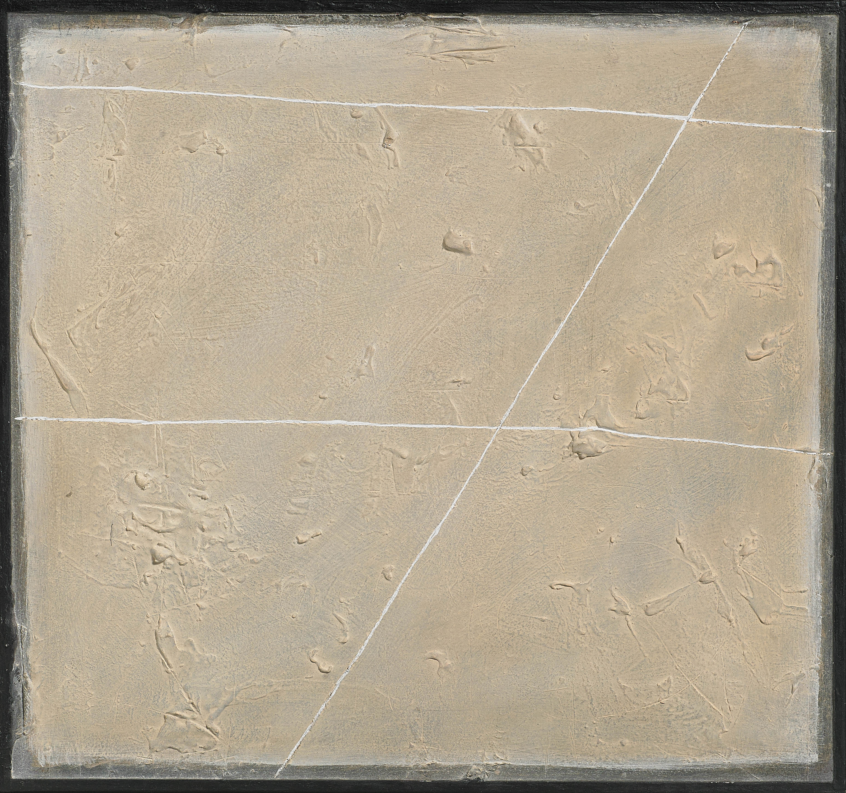 "das zu Lesende". 1995. Mischtechnik auf Holz. 32 x 34,5cm. Verso signiert, betitelt, bezeichnet und datiert: Karl Morgenstern "das zu Lesende" 1995 49-21. Rahmen (35,5 x 38cm).